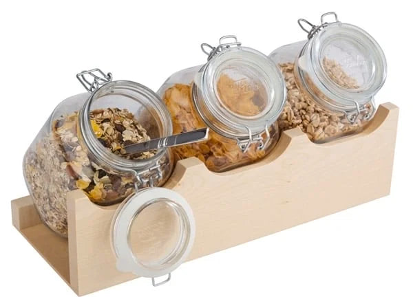 Der Buffetständer "Good Morning" bietet mit der leicht horizontal ausgelegten Präsentationsform Platz für drei Vorratsgläser. Hergestellt aus massiven Ahorn ist der Ständer sehr robust und durch die praktische Formgebung standfest. Durch hochwertige Verarbeitung und der besonderen Materialeigenschaft ist der Buffetständer besonders langlebig. Die außergwöhnliche Präsentationform ermöglich eine überschaubare Darstellung der angeboteten Speisen. Die formschönen Gläser können z.B. mit Müslis, Flocken, Marmelade, Süßigkeiten uvm. befüllt werden. Ideal für das Frühstücksbuffet ausgelegt.