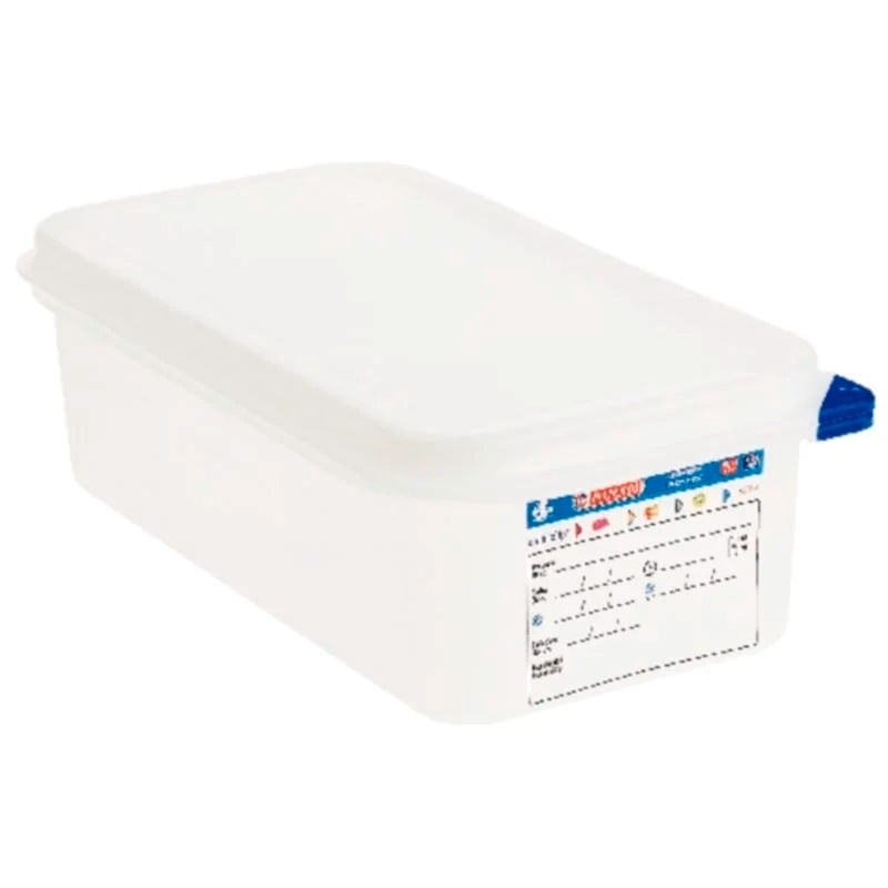 Luftdicht verschließbarer Gastronormbehälter mit Deckel. Jeder Behälter wird mit einer Reihe von Farbkodierungsclips (Rot, Gelb, Grün, Blau) geliefert. Mittels der mitgelieferten Clips können Sie ihr HACCP-Konzept bequem umsetzen. Geeignet für Temperaturen von -40°C bis +95°C. Mikrowellen- und geschirrspülergeeignet.