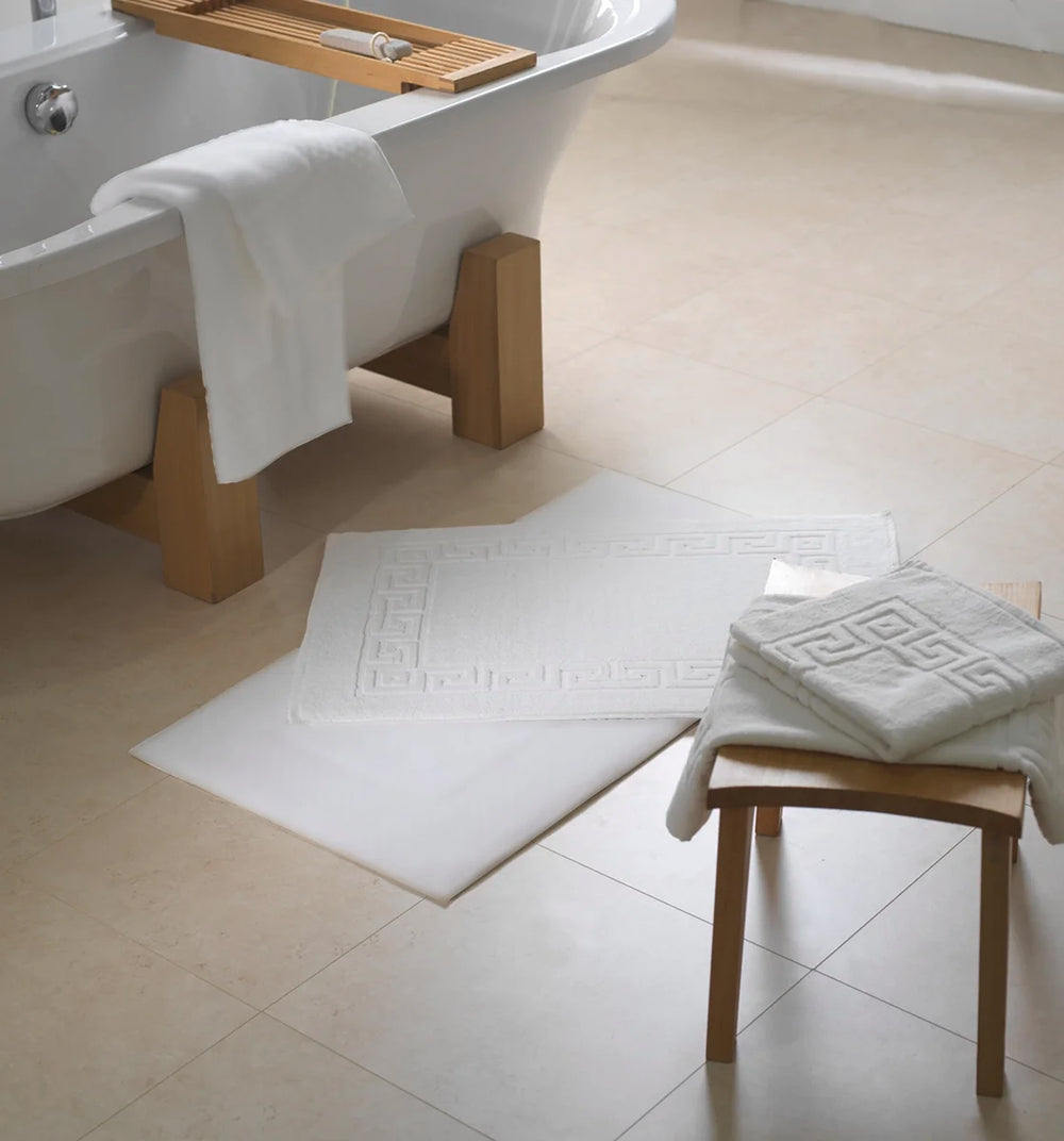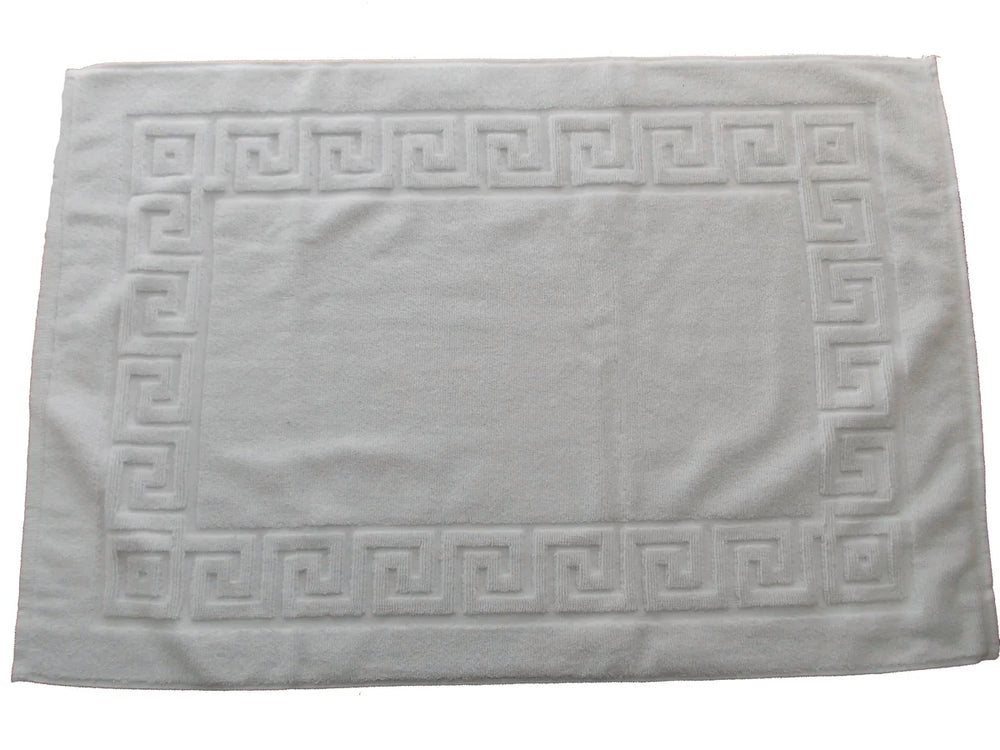 Die weiße, rechteckige Badematte aus strapazierfähigem Zwirnfrottier ist besonders saugfähig. Das Mäandermuster wirkt dezent und elegant. Mit der Bordüre im griechischem Stil fügt sich die Fußmatte hervorragend in jedes Gästebad ein und sorgt nach dem Duschen oder Baden für ein wohliges Gefühl an den Füßen Ihrer Gäste.