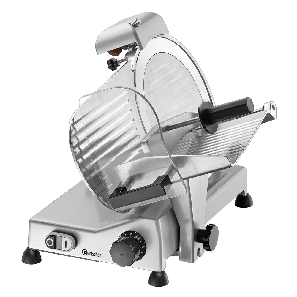 Die Ausstattung der optimierten Aufschnittmaschine mit einem 275er Messer überzeugt durch technische Features in mehrfacher Hinsicht. Der leistungsstarke Schrägschneider verfügt über einen Restehalter, einen Messerschärfer, eine Aufschnittführung und um die Sicherheit zu gewährleisten einen zweifachen Messerschutz sowie einen Magnetschalter.