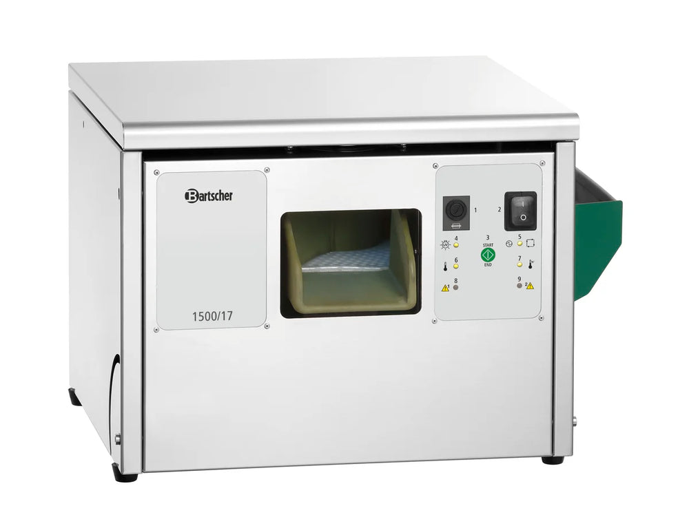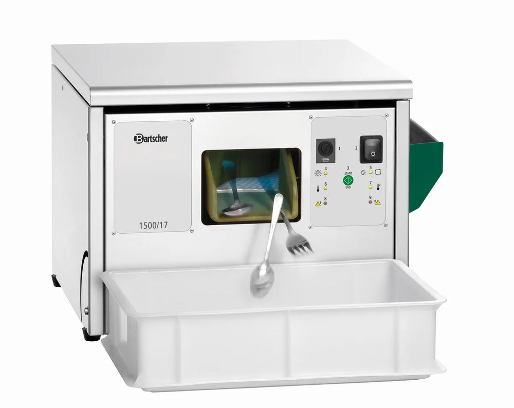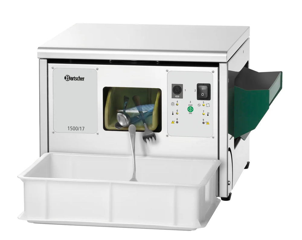 Mit der Besteckpoliermaschine 1500/17 von Bartscher wird Ihr Besteck auf Hochglanz poliert. Dank der integrierten UV-Lampe und der HACCP-konformen Betriebstemperatur werden bis zu 1500 Besteckteile pro Stunde hygienisch frisch desinfiziert.
