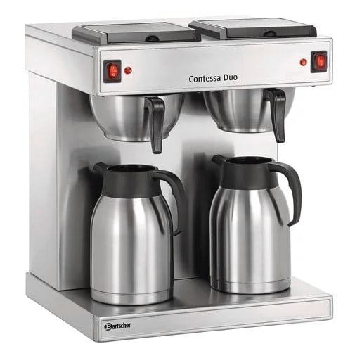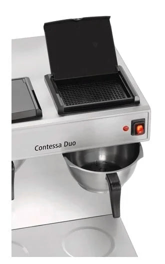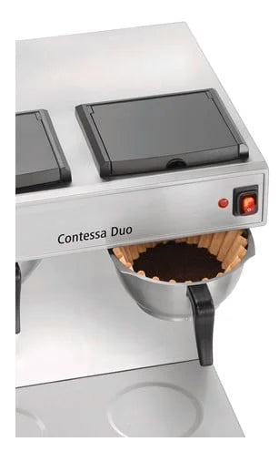 Die perfekte Kaffeemaschine für den Kaffeeausschank von Filterkaffee am Buffet, beim Catering oder auf Veranstaltungen. Mit der Contessa Duo lassen sich bis zu 13 Tassen je Kochstelle direkt in die Isolierkanne zubereiten. Die verbesserten Heizelemente aus Edelstahl bieten eine optimierte Wärmeübertragung.