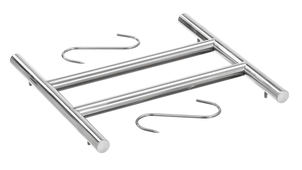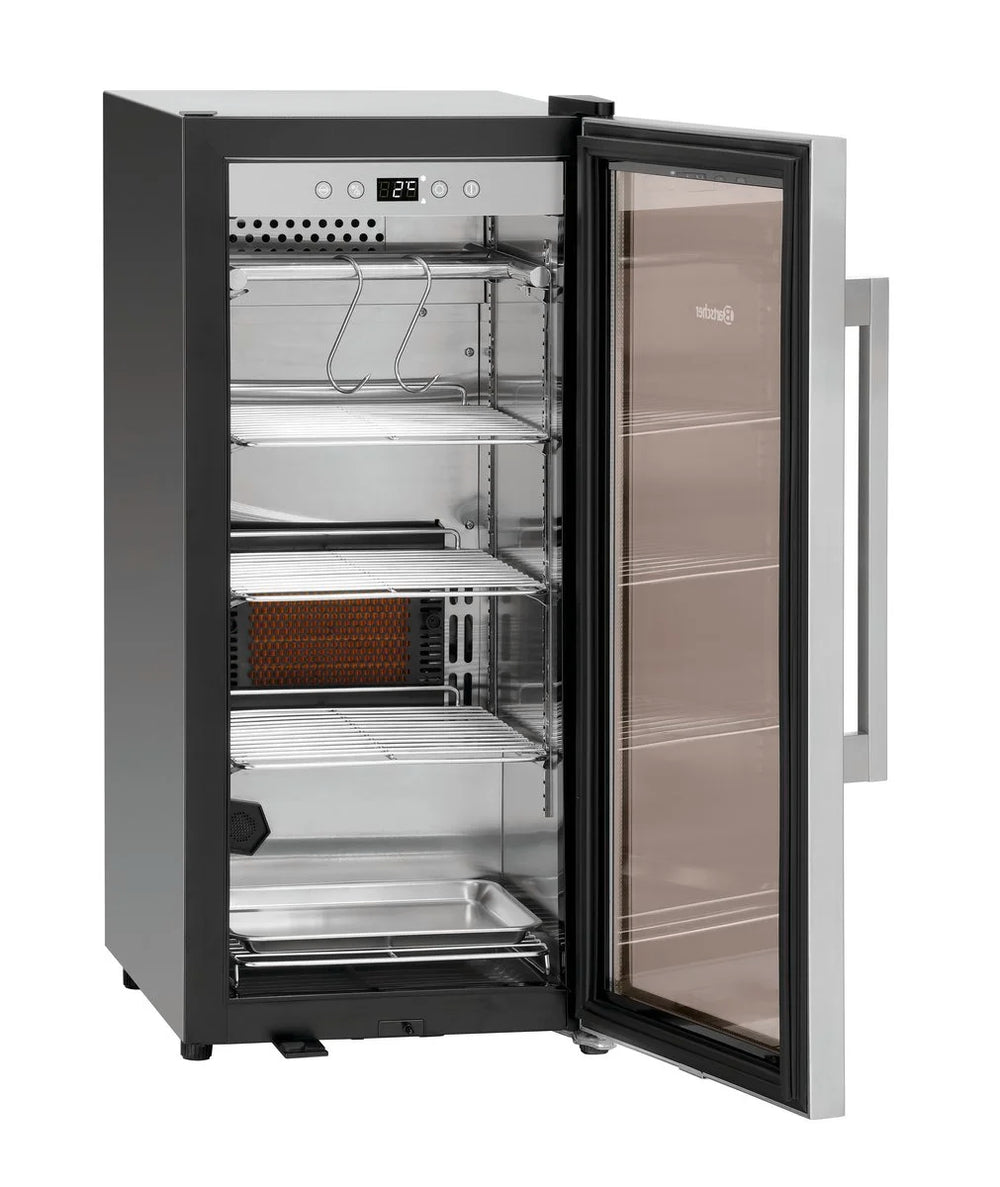 - Inklusive: 1 Aktivkohlefilter ,1 Auffangblech ,1 Griff mit Montagematerial ,1 Hängegestell + 3 Fleischer-Haken ,1 Wasserspeicher + 1 Ersatzspeicher + Halterung + Abtropfschale ,2 Schlüssel ,4 Edelstahlroste