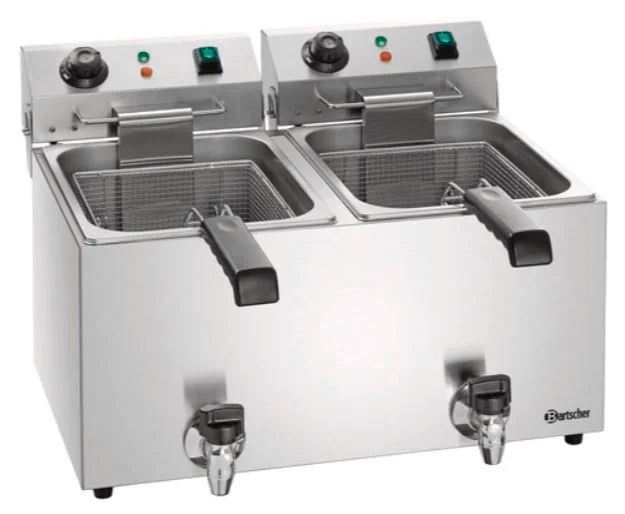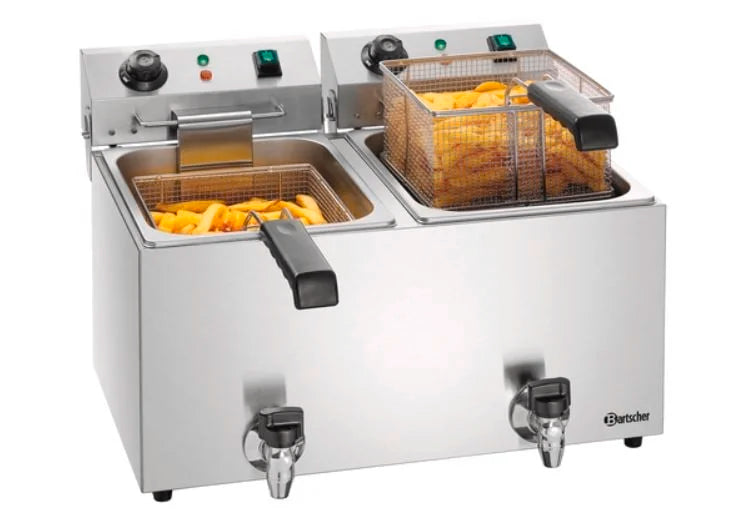 Die Doppel-Fritteuse bereitet verschiedenste Snacks schnell und zuverlässig zu. Dank des praktischen Fettablasshahns und des schwenkbaren Heizelements ist auch die anschließende Reinigung zügig erledigt.