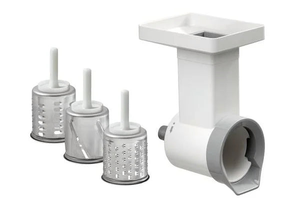 - Set bestehend aus: 1 Birchertrommel (Trommel mit Wellenschliff), 1 Gemüseschneider, 1 Scheibentrommel