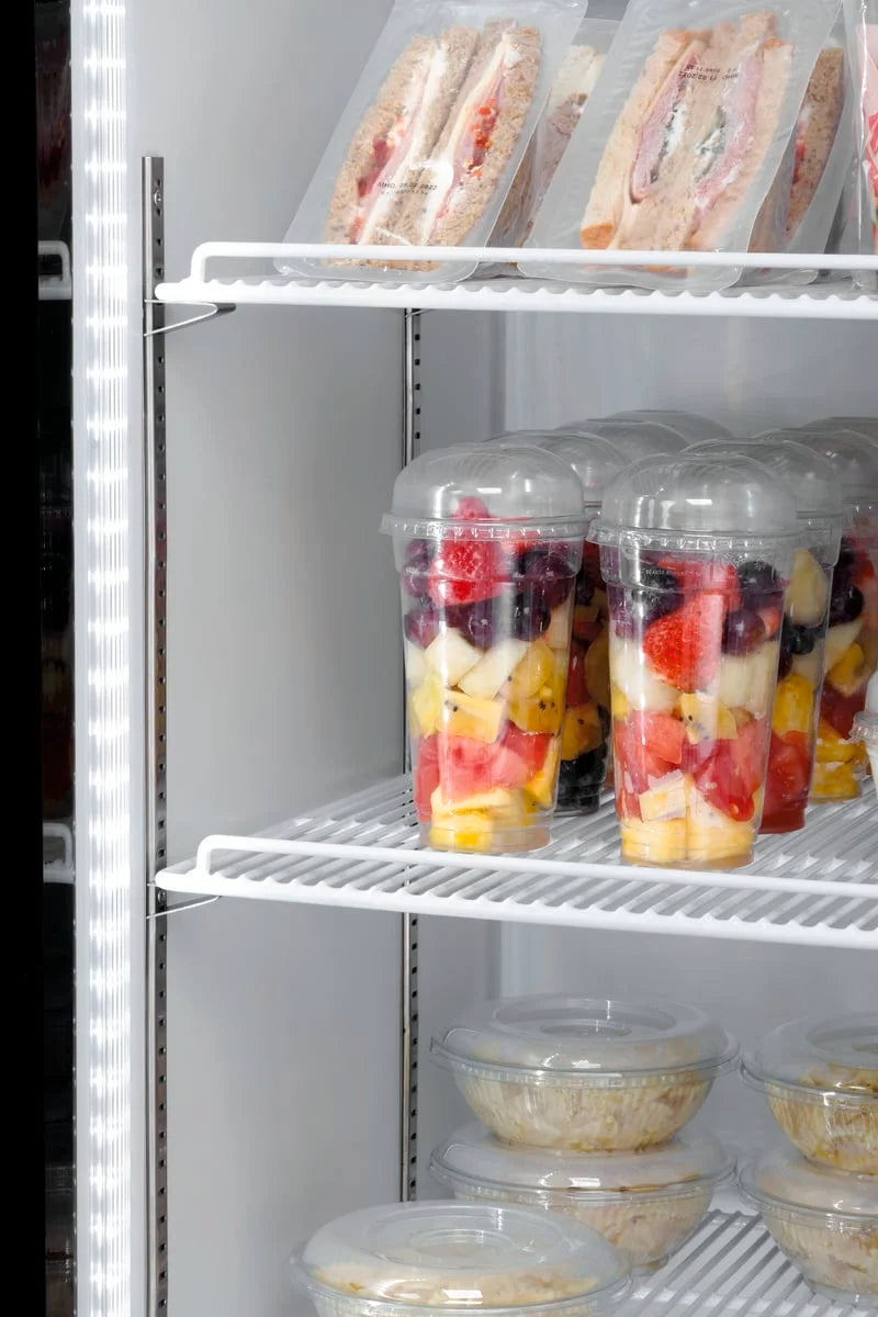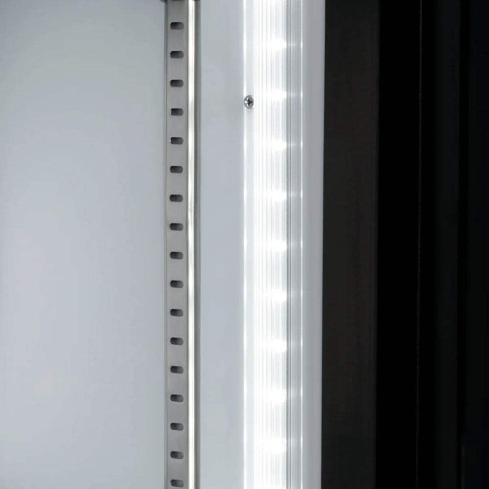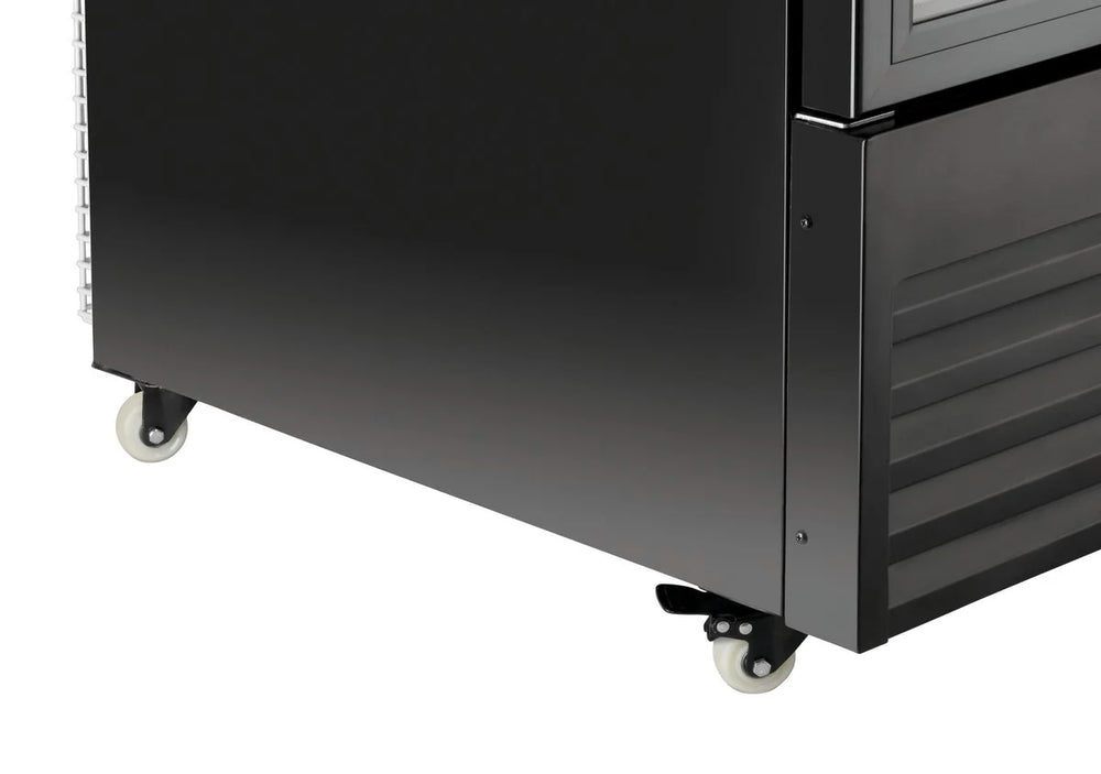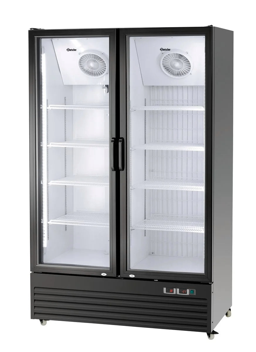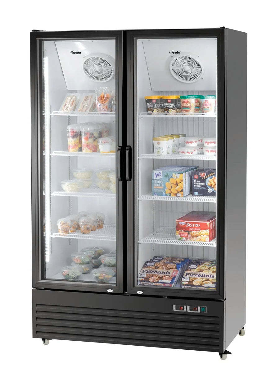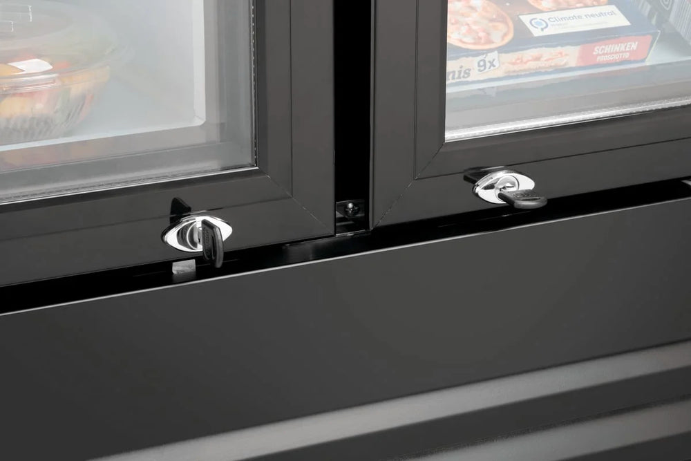 Kombination aus Kühlschrank und Tiefkühlschrank im ansprechenden schwarzen Design mit einem Fassungsvermögen von 820 Litern. Die Glastüren ermöglichen einen direkten Einblick auf die Speisen, die durch die separat schaltbare LED-Beleuchtung ins rechte Licht gerückt werden können.