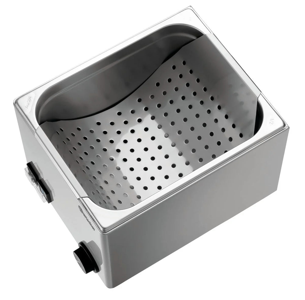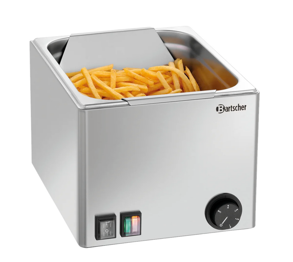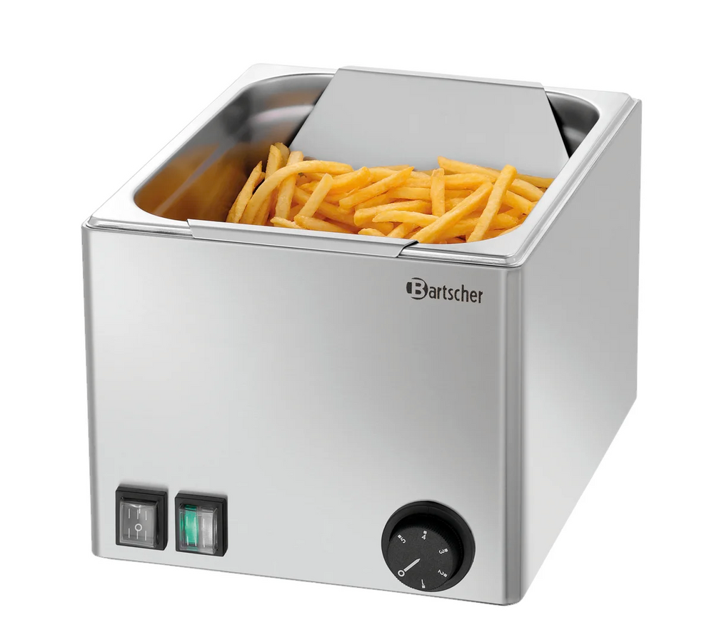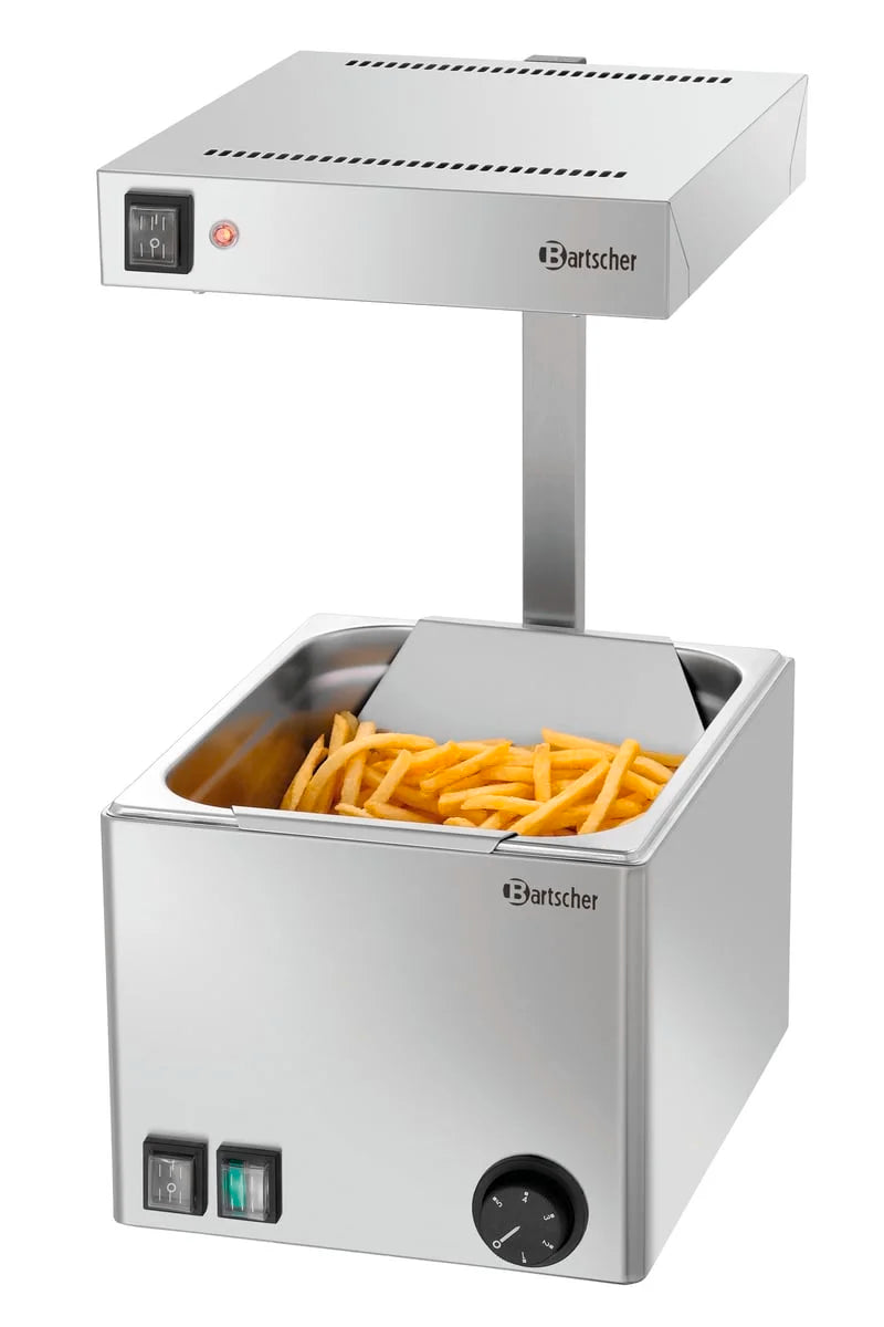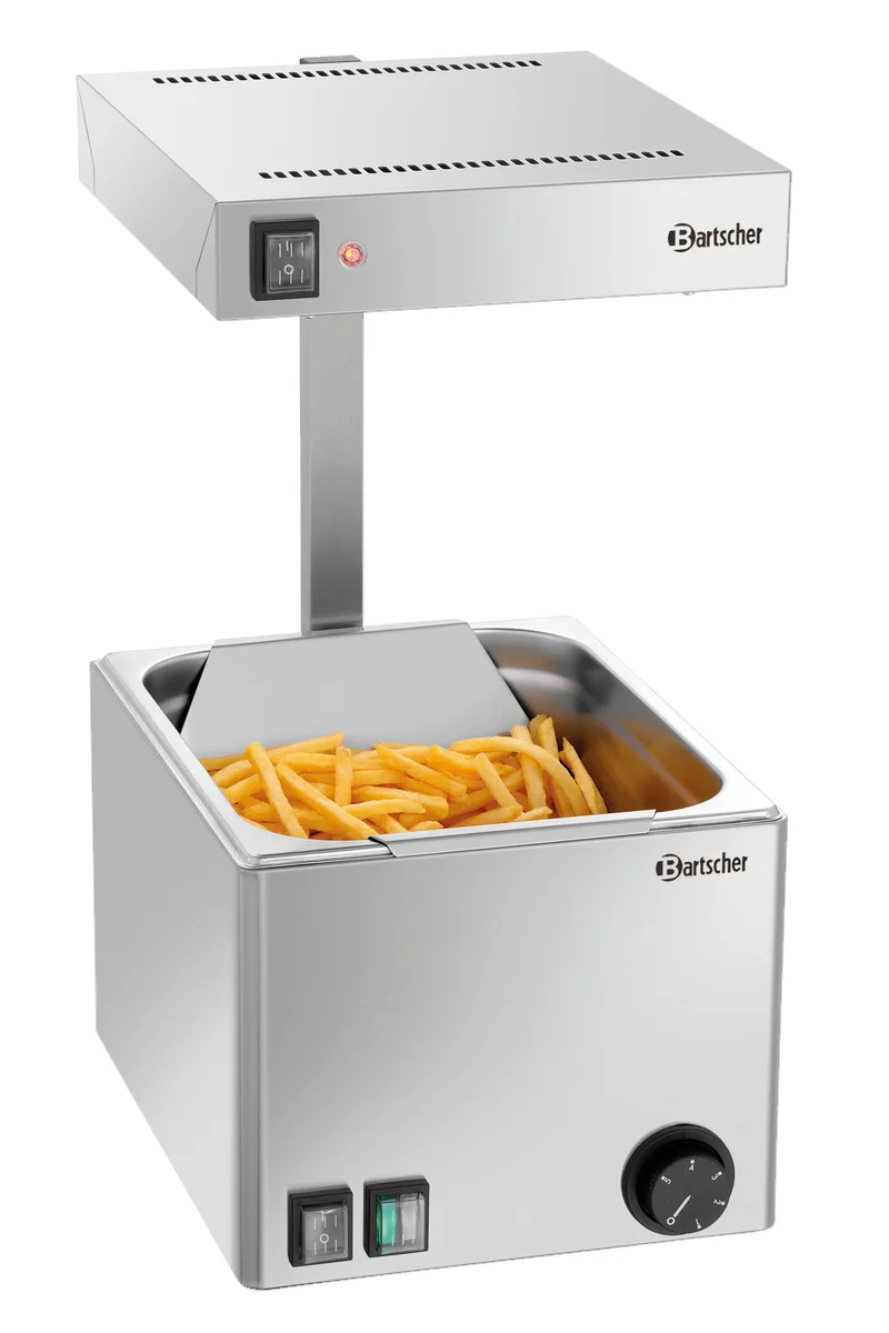 Dieser Pommeswärmer findet auch in der kleinsten Küche seinen Platz. In dem beheizten Becken mit Abtropfblech werden Pommes-Frites warm und kross gehalten. Die optional erhältliche Wärmelampe ist bestens für eine Montage an den Pommeswärmer ausgelegt und kann so auch zusätzlich Wärme von oben abgeben.