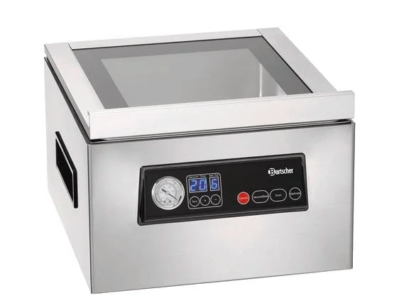 Alles im Blick: Das Kammer-Vakuumiergerät ist mit einem Glasdeckel und einem Manometer zur Überwachung des Unterdrucks ausgestattet. Ein Klemmbügel in der Kammer verhindert ein Verrutschen der Vakuumierbeutel.