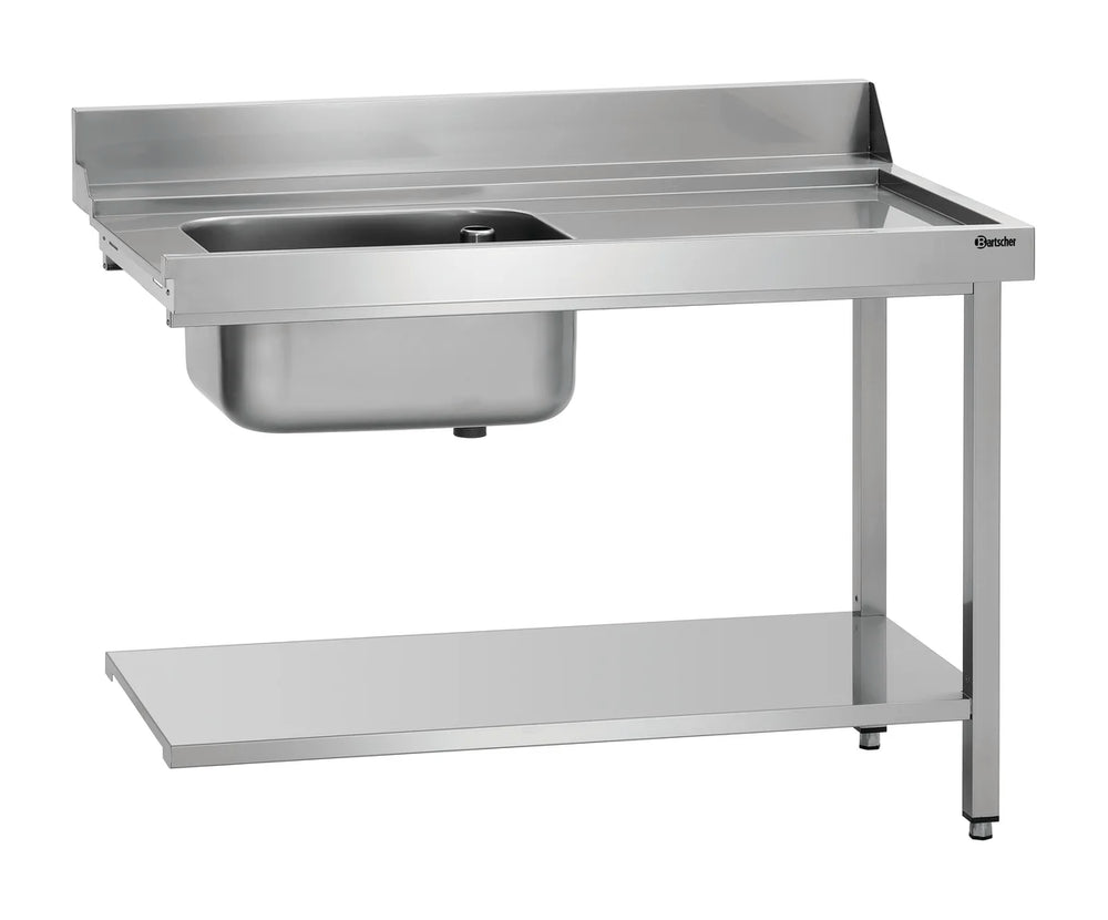 Die 1,2 m breite Vorabräumung mit Spüle ist ausgelegt für den rechtsseitigen Anbau an die Bartscher Durchschubspülmaschinen DS. Ein Grundboden bietet Abstellfläche für Spülkörbe.