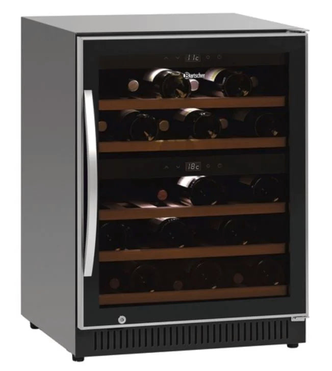 Der hochwertige Weinkühlschrank verbindet elegantes, schwarzes Design mit professioneller Technik – ideal für den Einsatz im Bar- und Restaurantbereich. Zwei getrennte Temperaturzonen (je 5–20 °C) schaffen perfekte Bedingungen für Rot- und Weißweine. Dank laufruhigem Kompressor, aktivem Lüfter und UV-geschützter Doppelverglasung bleiben Aroma und Struktur Ihrer Weine optimal erhalten. Kugelgelagerte Holzlagerböden sorgen dabei für komfortablen Zugriff – selbst bei voller Bestückung.
