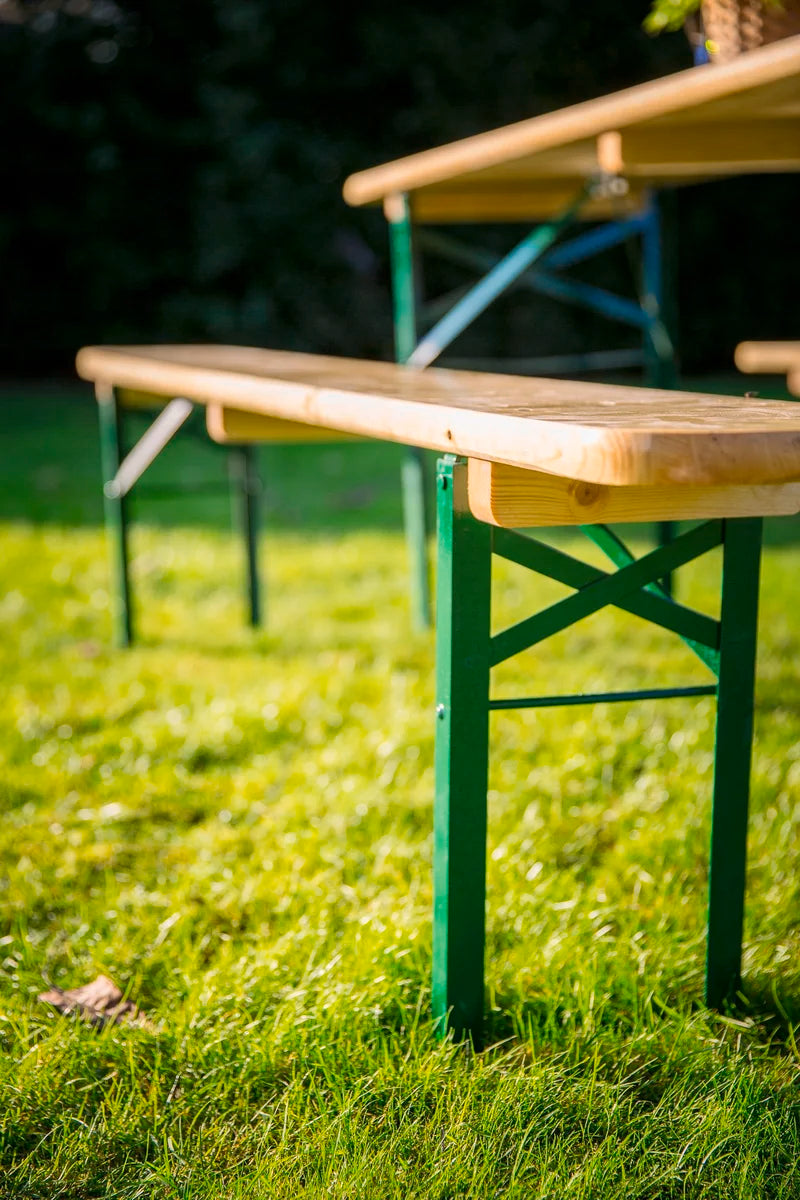 Diese Bierbank wird immer für viele verschiedene Feste vermietet und meistens auch gemeinsam mit den Biertischen bestellt. Die Bierbank ist mit 3 Stapelleisten versehen, wobei die äußeren durchgeschraubt und geleimt sind. Eine zusätzliche Stapelleiste in der Mitte ist geschraubt verschraubt und geleimt. Das grüne Gestell ist aus Winkeleisen, was für mehr Stabilität sorgt. Die 28 mm starke Sitzfläche ist auf der Ober- und Unterseite 3-mal lackiert und mit einem klaren Schutzanstrich versehen. Zudem sind alle Kanten abgerundet, sodass beim Stapeln möglichst wenige Kratzer auf den Sitzflächen entstehen.