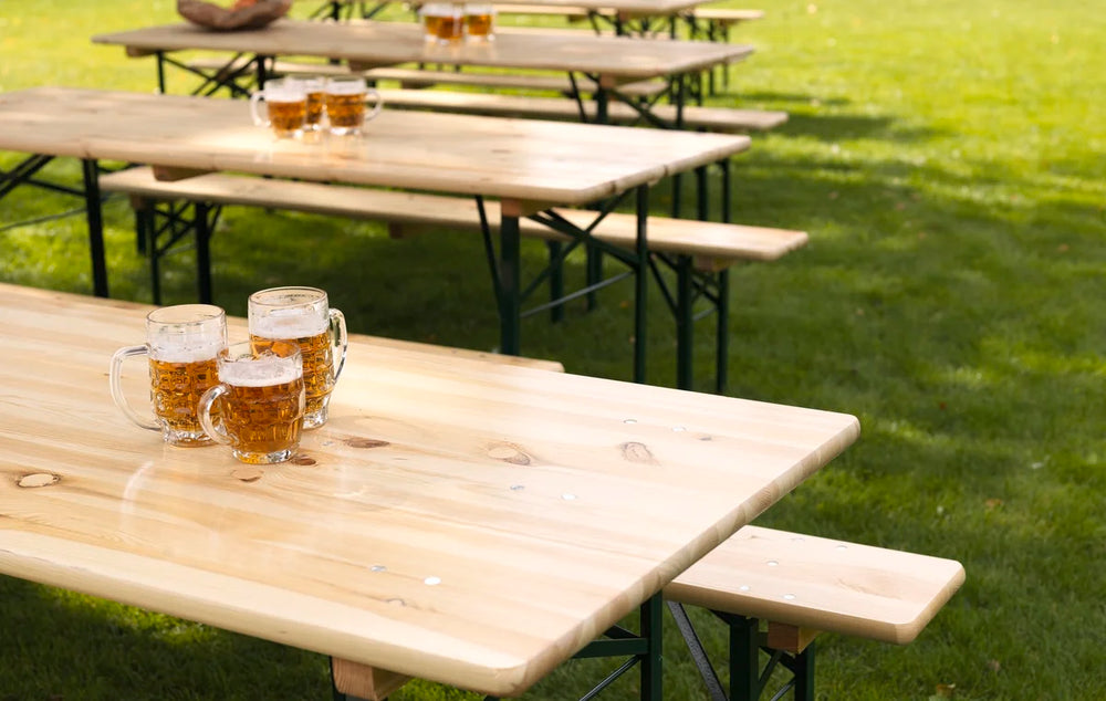 Dieser Biertisch wird oftmals für viele verschiedene Feste vermietet. Der Biertisch ist mit 3 Stapelleisten versehen, wobei die äußeren durchgeschraubt und geleimt sind. Eine weitere Stapelleiste in der Mitte ist verschraubt und geleimt. Das grüne Gestell ist aus Winkeleisen, was für mehr Stabilität sorgt. Die 28 mm starke Tischplatte ist auf der Ober- und Unterseite 3-mal lackiert und mit einem klaren Schutzanstrich versehen. Zudem sind alle Kanten abgerundet, sodass beim Stapeln möglichst wenige Kratzer auf den Tischplatten entstehen.