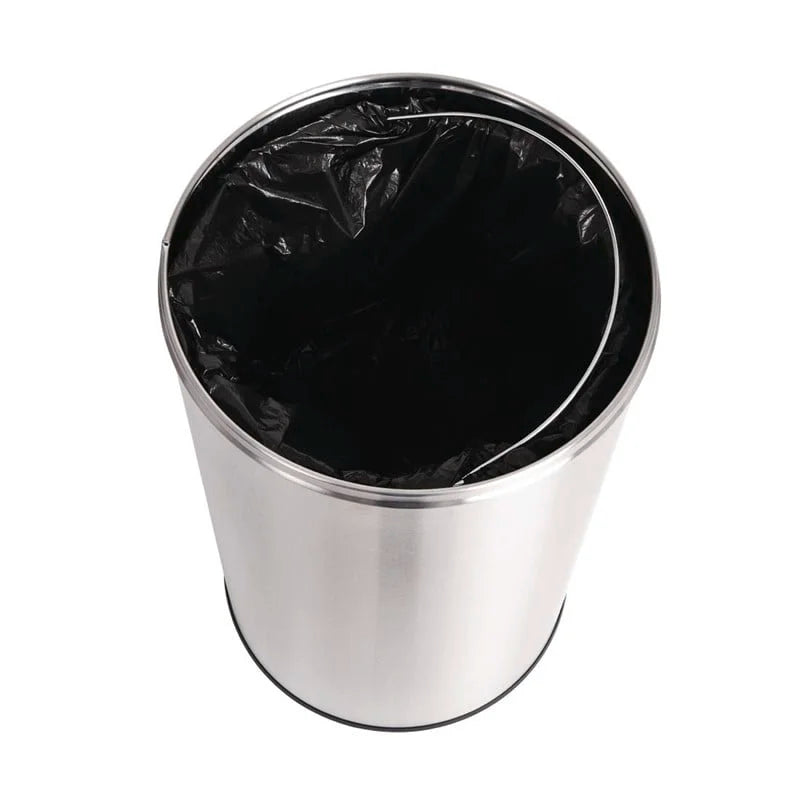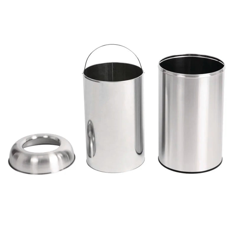 - Hochwertiger Edelstahl-Abfallbehälter mit offenem Deckel. Dieser attraktive und robuste Abfallbehälter ist ideal für den Einsatz in Gästebereichen. Der Polypropylenring um die untere Basis schützt den Boden und verbessert die Stabilität. Mattes Finish.