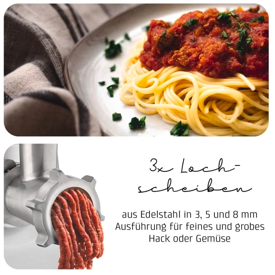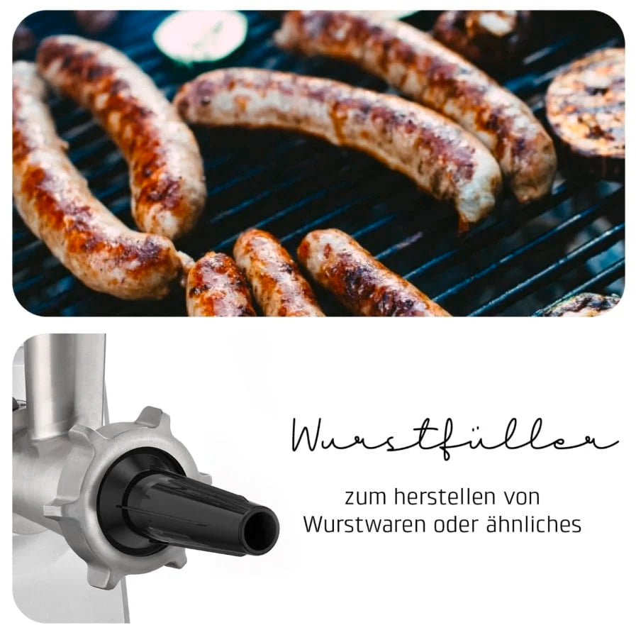 - Inkl. 3 Edelstahl-Lochscheiben (3 mm, 5 mm und 8 mm), Wurstfüller, Spritzgebäck‐Aufsatz mit 4 Formen, Stopfer