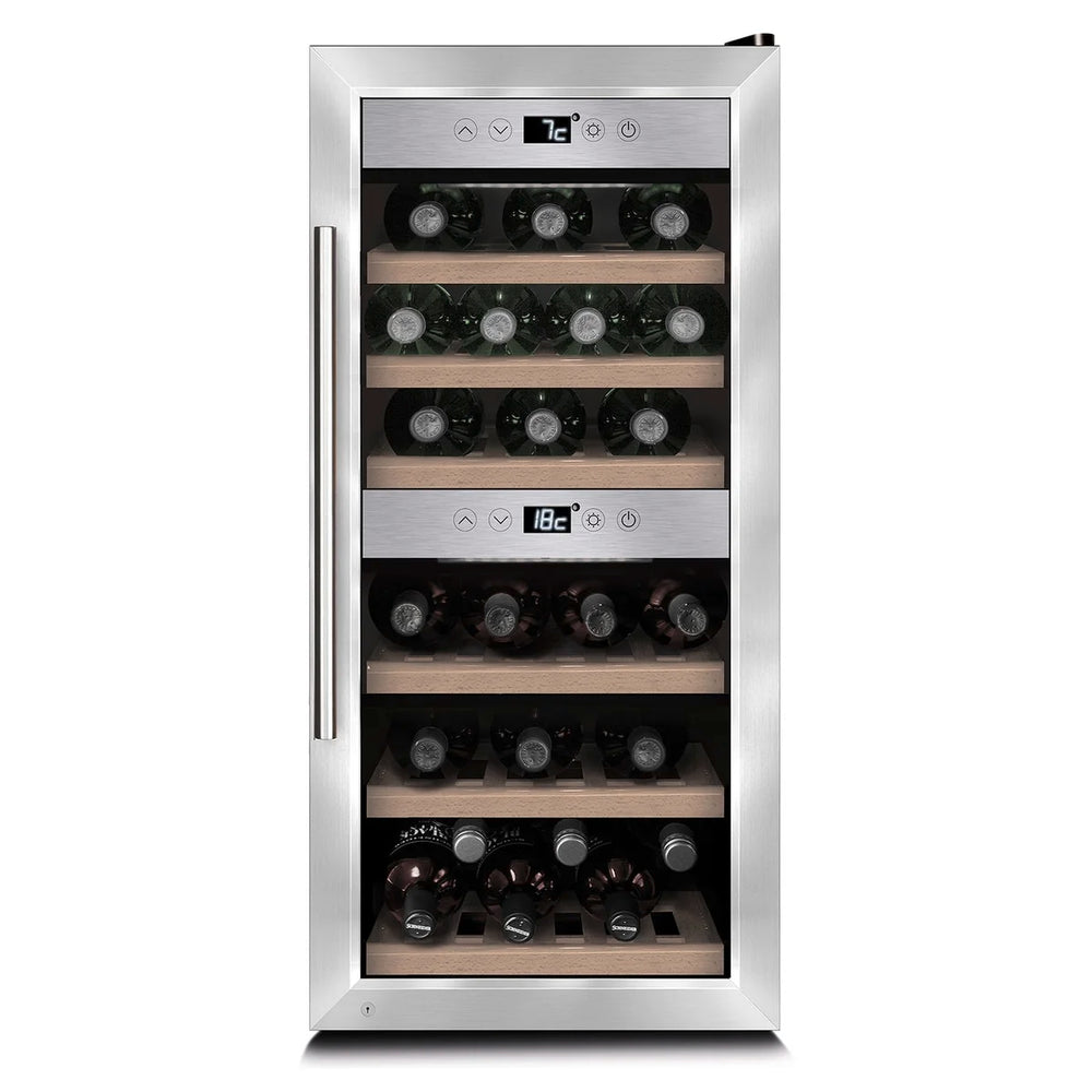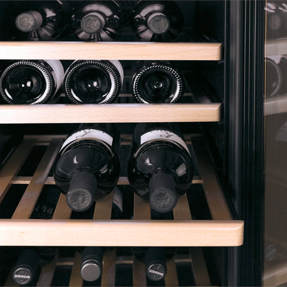 - Zwei getrennte Temperaturzonen, einzeln regelbar für Weiß- & Rotwein