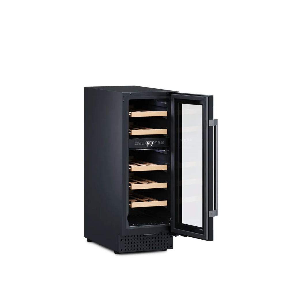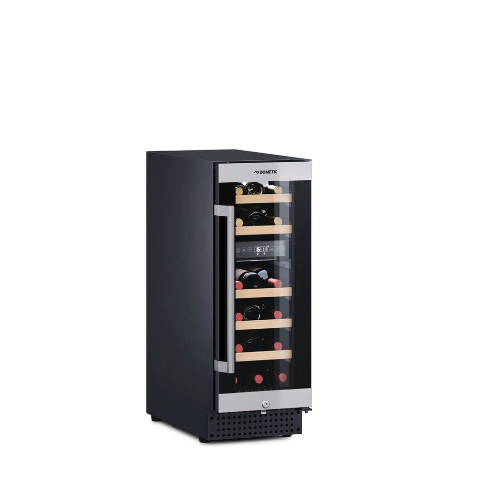 Der Dometic C18B Weinkühlschrank in klassischem Design passt zu jeder Inneneinrichtung. Der Weinkühlschrank kann freistehend oder als Einbaumöbel in Standard-Küchentheken integriert werden. Füße und Sockel können angepasst werden, sodass sie der Höhe der Küchenschränke entsprechen. Der Weinkühlschrank bietet Platz für 18 Weinflaschen, die auf eleganten Ablagefächern aus Holz präsentiert werden.
