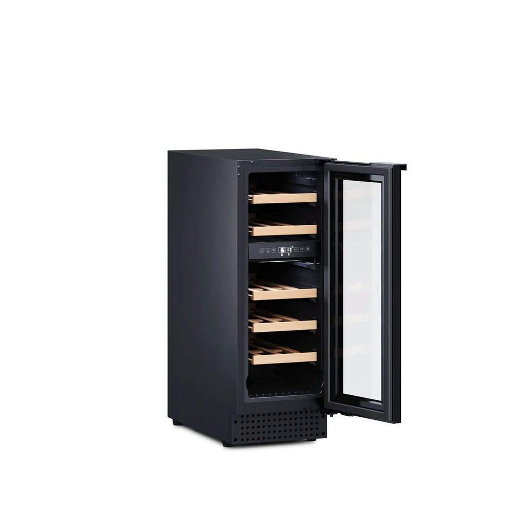 Der Dometic D18B Weinkühlschrank in klassischem Design passt zu jeder Inneneinrichtung. Der Weinkühlschrank kann freistehend oder als Einbaumöbel in Standard-Küchentheken integriert werden. Füße und Sockel können angepasst werden, sodass sie der Höhe der Küchenschränke entsprechen. Der Weinkühlschrank bietet Platz für 18 Weinflaschen, die auf eleganten Ablagefächern aus Holz präsentiert werden.