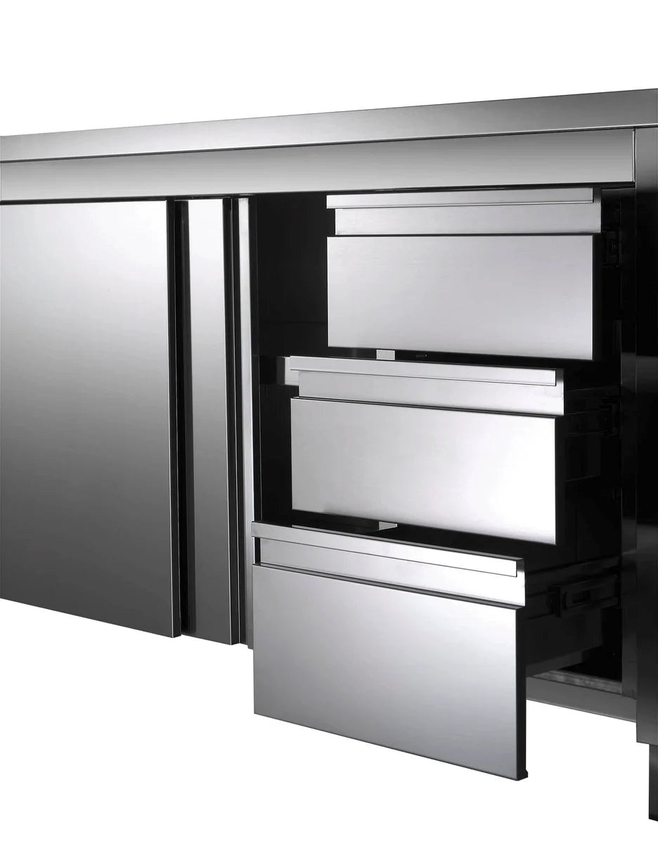 Edelstahl-Arbeitsschrank ECO mit Schiebetür und 3 Schubladen 20x7