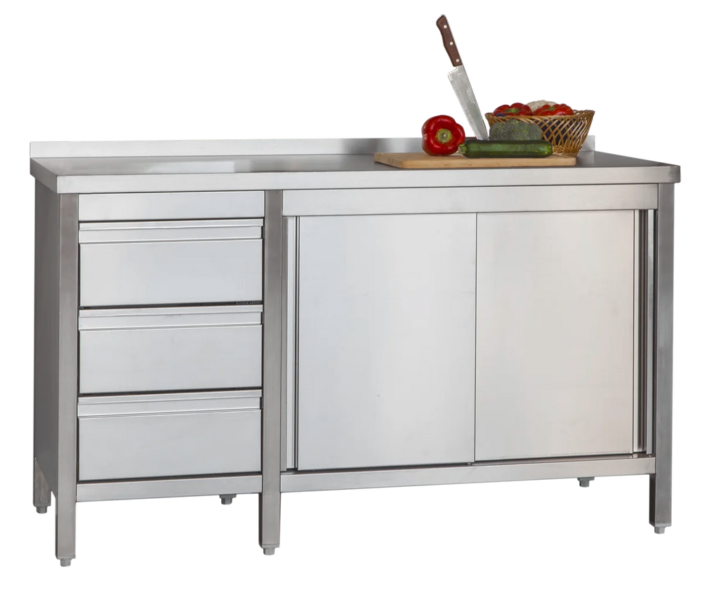 Edelstahl Arbeitsschrank Profi mit Schiebetüren - Aufkantung und 3 Schubladen 1600 x 700 x 850 mm