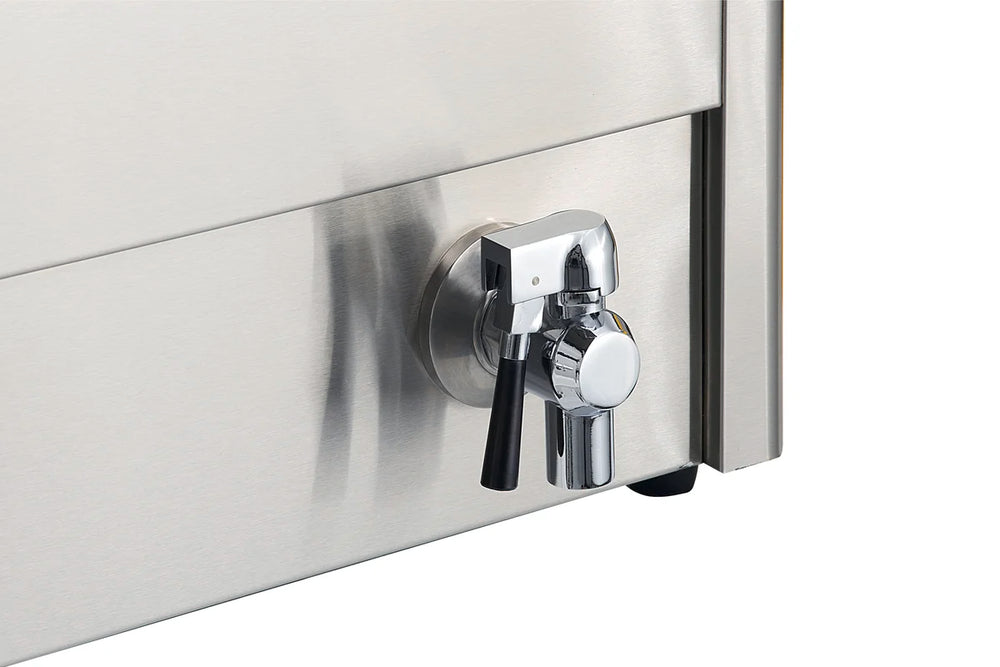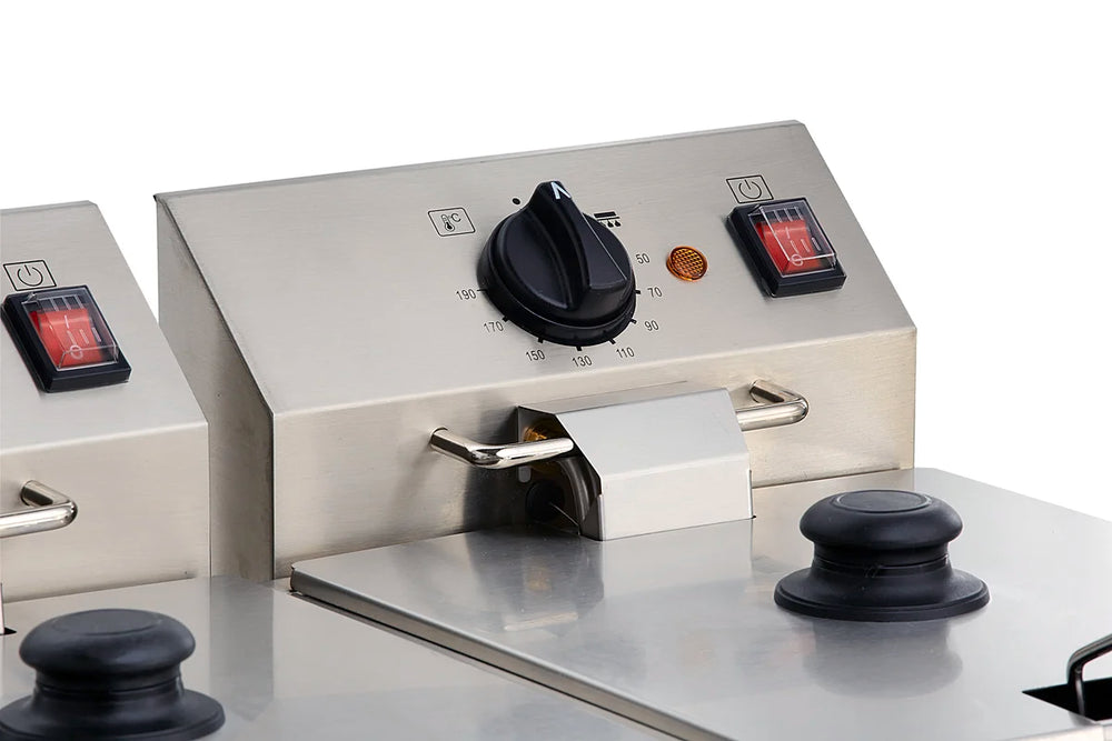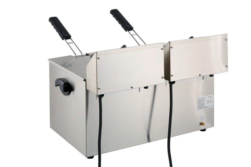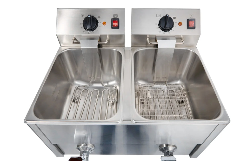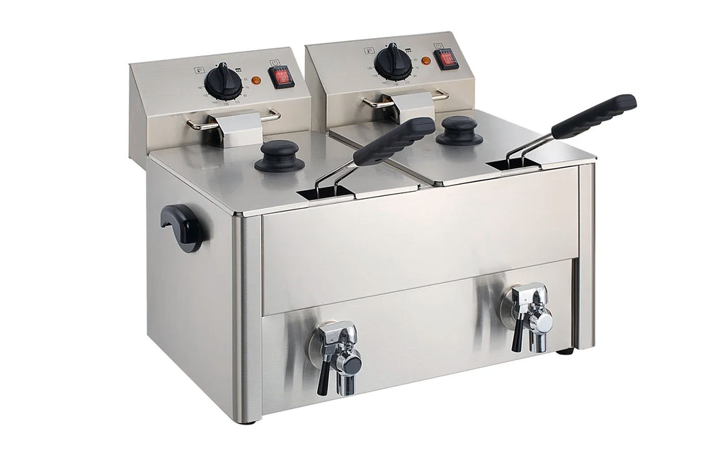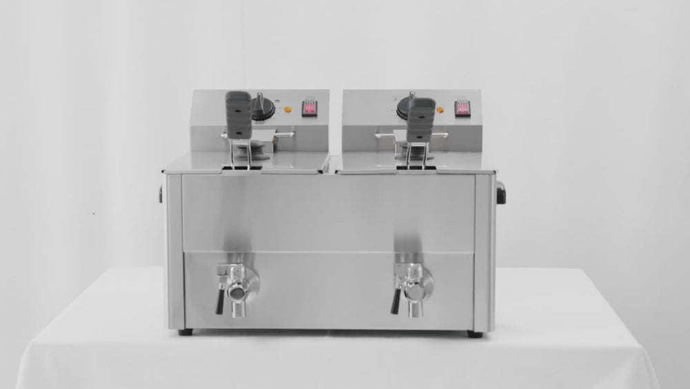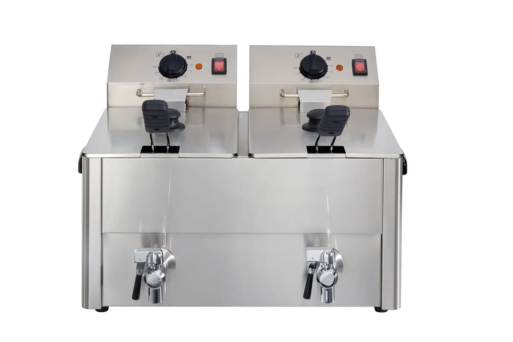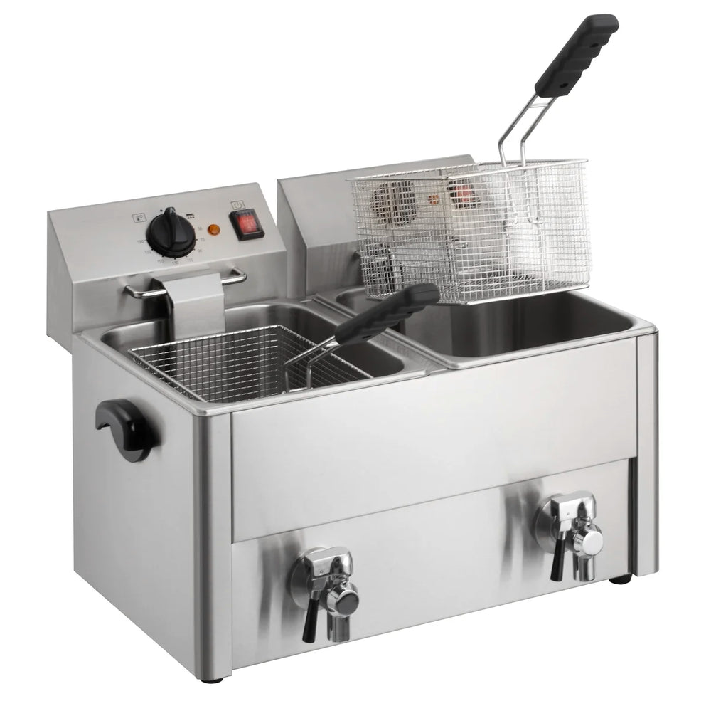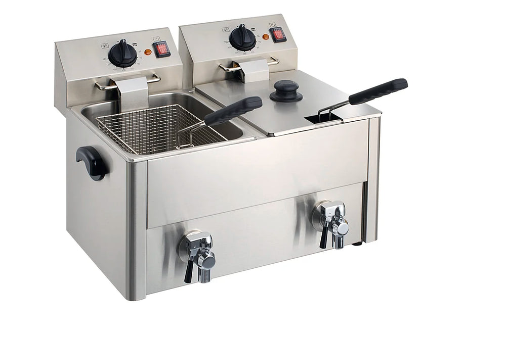Unsere Elektro-Doppel-Fritteuse ECO 10+10 Liter mit Ablasshahn überzeugt, neben einem modernen Design, durch eine besonders hohe langlebigkeit und einem sehr guten Preis-Leistungs-Verhältnis. Durch einen vorhandenen Ablasshahn können Sie das Öl schnell und sicher ablassen. Wir bieten Ihnen mit diesem Qualitätsprodukt ein langlebiges und effizientes Kochgerät für Ihre Profi Küche.