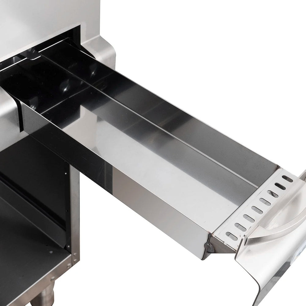- Eine herausnehmbare Fettschublade ist direkt unter der Grillplatte platziert und fasst 2 Liter