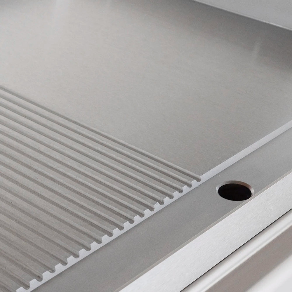- Mit ½ glatter und ½ gerillter Elektrogrillplatte und offenem Unterbau