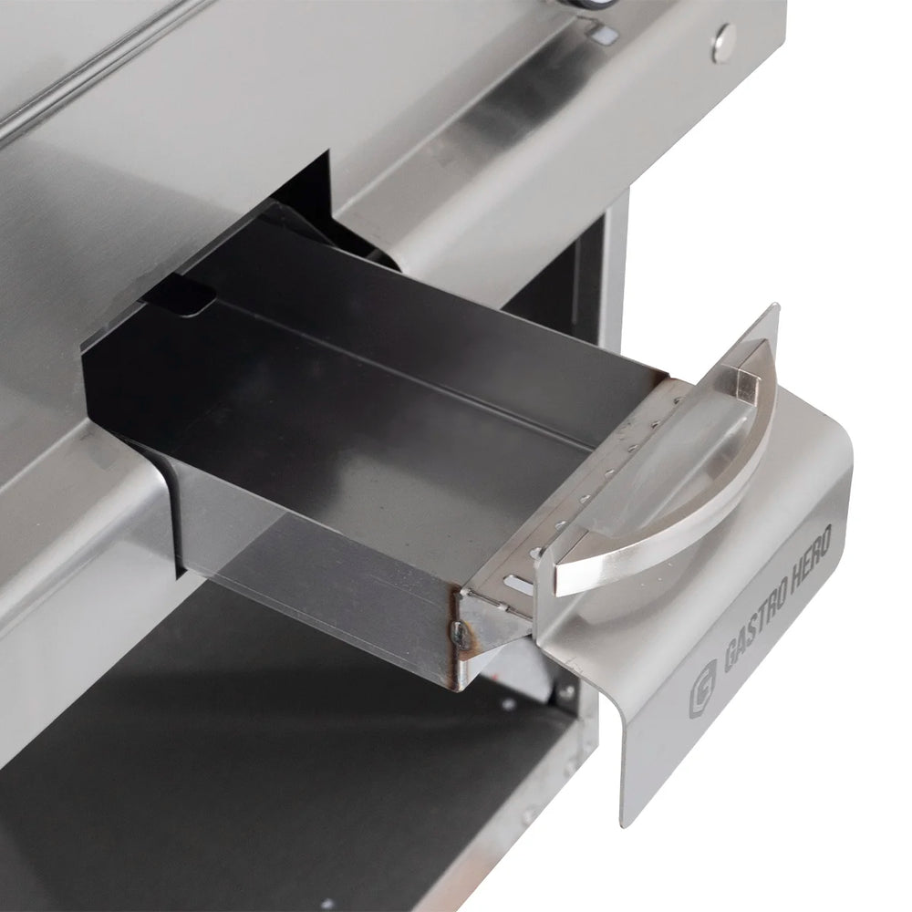- Eine herausnehmbare Fettschublade ist direkt unter der Grillplatte platziert und fasst 2 Liter