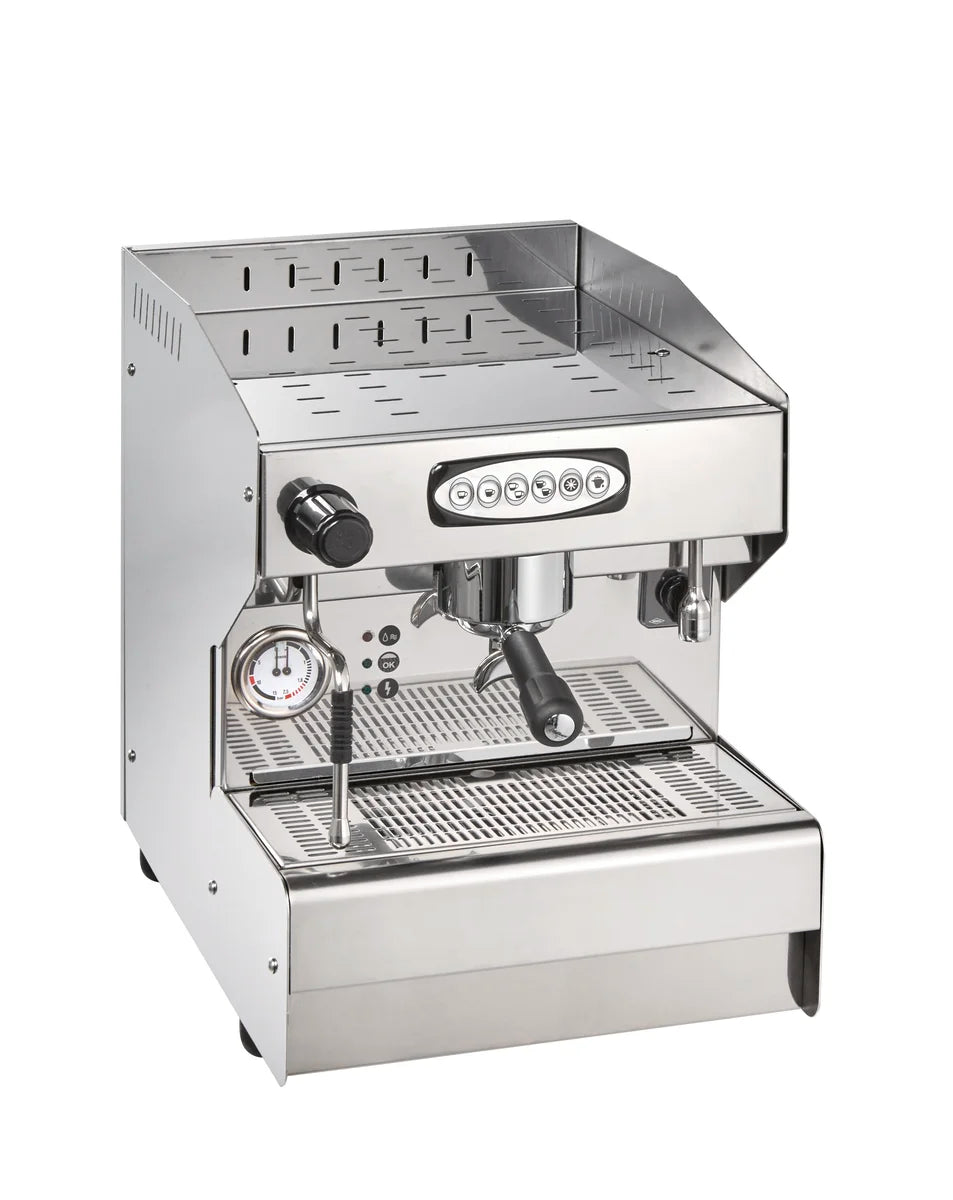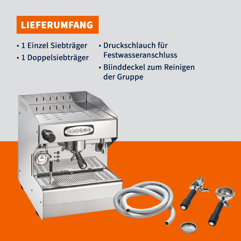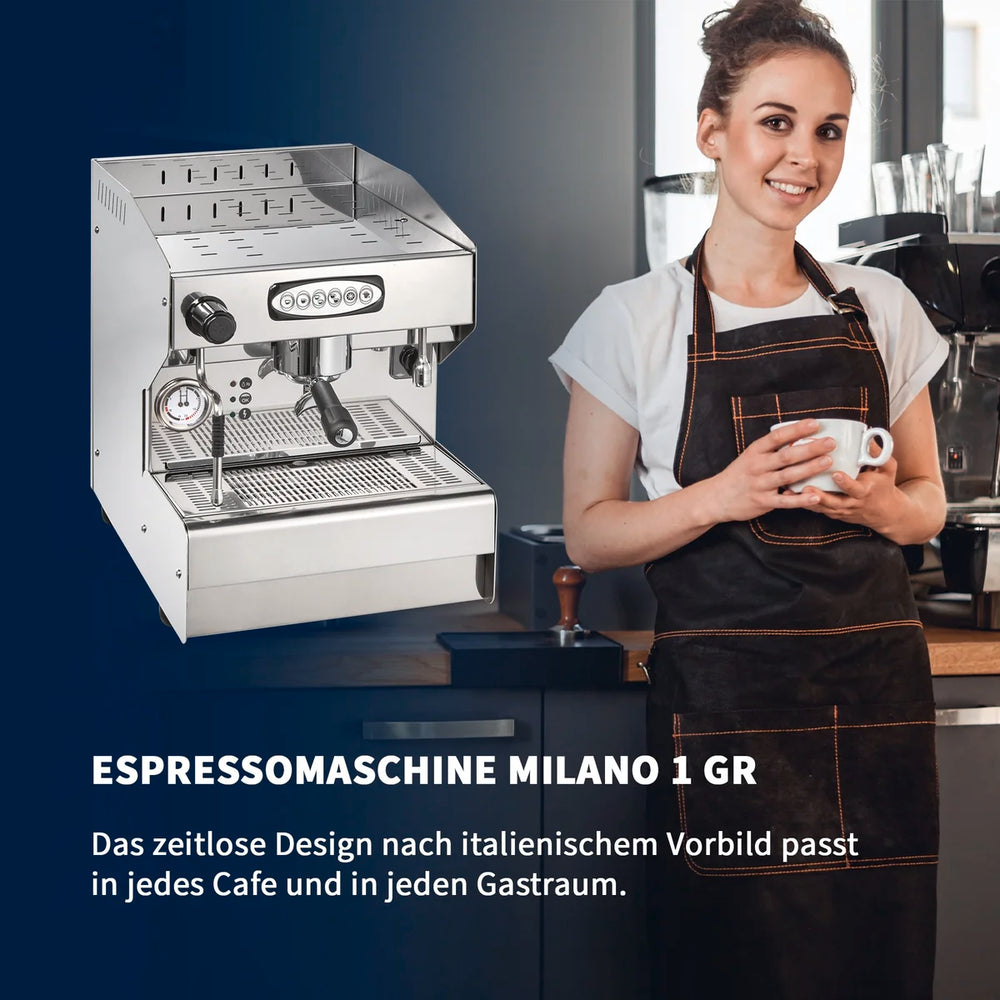 Die Espressomaschine MILANO 1 GR Automatik ist eine Siebträgermaschine mit einer Brüheinheiten und einer automatischern Wasserzuführ. Das zeitlose Design nach italienischem Vorbild passt in jedes Cafe und in jeden Gastrraum. Dank des Pre-Infusionssystems erhalten Sie eine besonders aromatische Kaffespezialität, die ihre Gäste überzeugen wird. Die einfache und anwenderfreundliche Bedienung runden dieses Qualitätsprodukt ab.