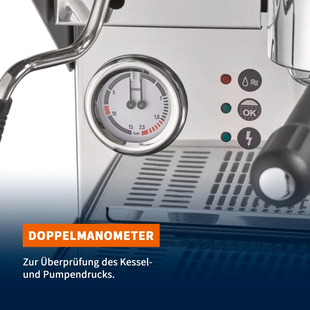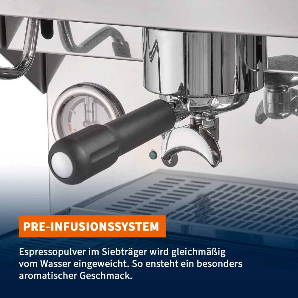 - System Pre-Infusion um das Kaffeemehl zu befeuchten, sodass es mehr Aroma zu entfalten kann