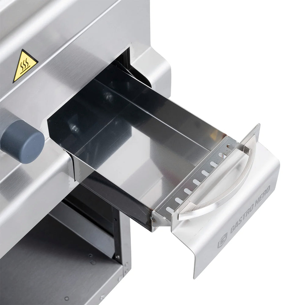 - Eine herausnehmbare Fettschublade ist direkt unter der Grillplatte platziert und fasst 2 Liter