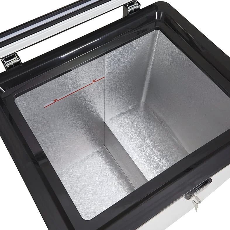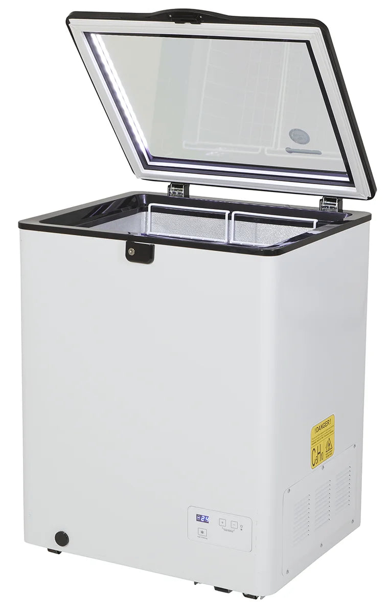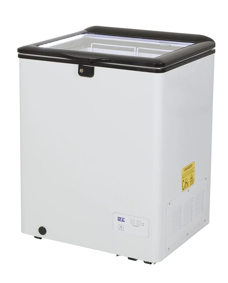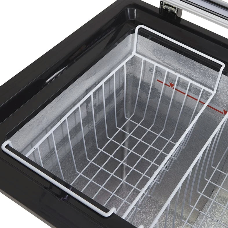 Der Glasdeckel mit LED sorgt für eine helle und effiziente Innenbeleuchtung. Der Blick fällt auf Eis und Getränke, arrangiert und geordnet in zwei entnehmbaren Gitterkörben. Die Kühltruhe kann ganz nach Wunsch zum Kühlen und Gefrieren eingesetzt werden. Schließlich umspannt das Kühlvermögen einen besonders variablen Temperaturbereich von – 24 bis 10°C. Die Temperatureinstellung erfolgt individuell, auch der Lichtschalter kann energieschonend ganz nach Bedarf eingesetzt werden. Vier Mobilitätsräder lassen die Gefriertruhe jederzeit den Standort wechseln. Einfach dort hinschieben, wo sie benötigt wird! Und sogar das Tragen der Kühltruhe fällt nicht ins Gewicht: Mit gerade einmal 31 kg bringt die Gefriertruhe niemanden ins Schwitzen. Die Kühltruhe gibt es auch mit blauem oder rotem Deckel, bei Fragen zum Produkt stehen wir Ihnen gerne zur Verfügung. Bei der Gefriertruhe mit Glasdeckel handelt es sich um ein Gewerbekühlgerät, das nur gewerblich eingesetzt werden darf.