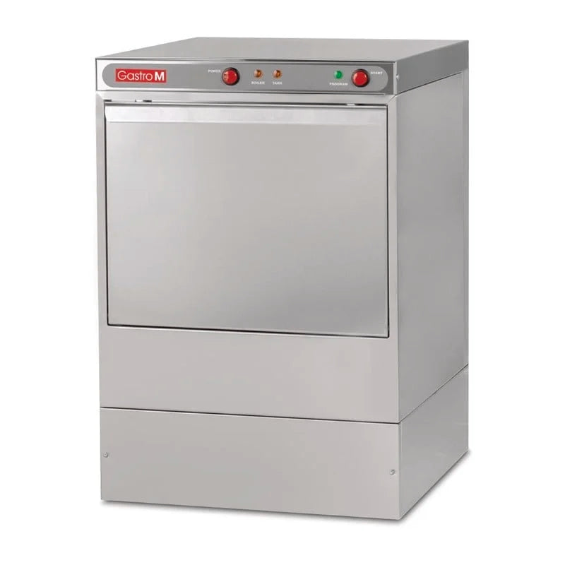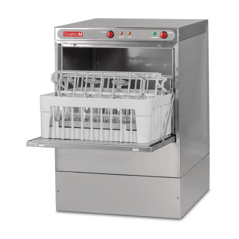Gläserspülmaschine mit Edelstahlgehäuse AISI 304 und doppelwandiger Tür, elektromechanisch, ein Waschprogramm, tiefgezogener Waschtank, automatischer Waschgang, thermostatgeregelter Tank und Heizkessel, automatische Wasserstandsregelung. Mit Hauptschalter und Programm-/Startschalter. Herausnehmbare Spülarme aus Edelstahl zur einfachen Reinigung. Sicherheitsschalter an der Tür. Komplett mit 2 Spülkörben 40 x 40cm, Besteckbehälter, Tellerspülkorb und Klarspülerfach. Maximale Gläser- und Tellerhöhe: 29cm.