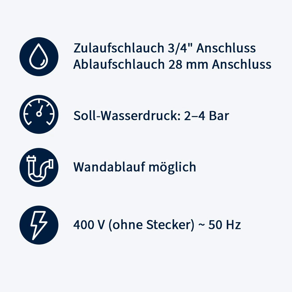 - Geräte mit Festwasseranschluss müssen, mit einer geeigneten Wasseraufbereitung, von einem Fachmann installiert und in Betrieb genommen werden.