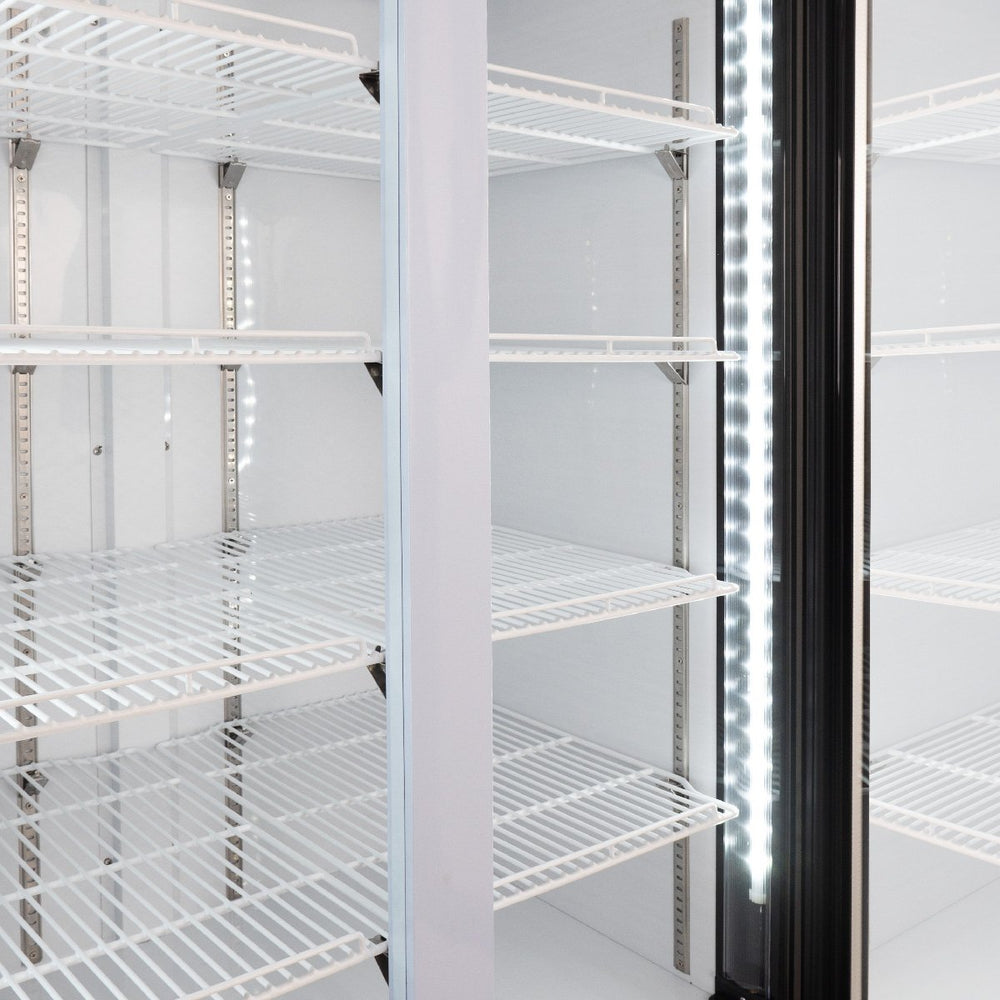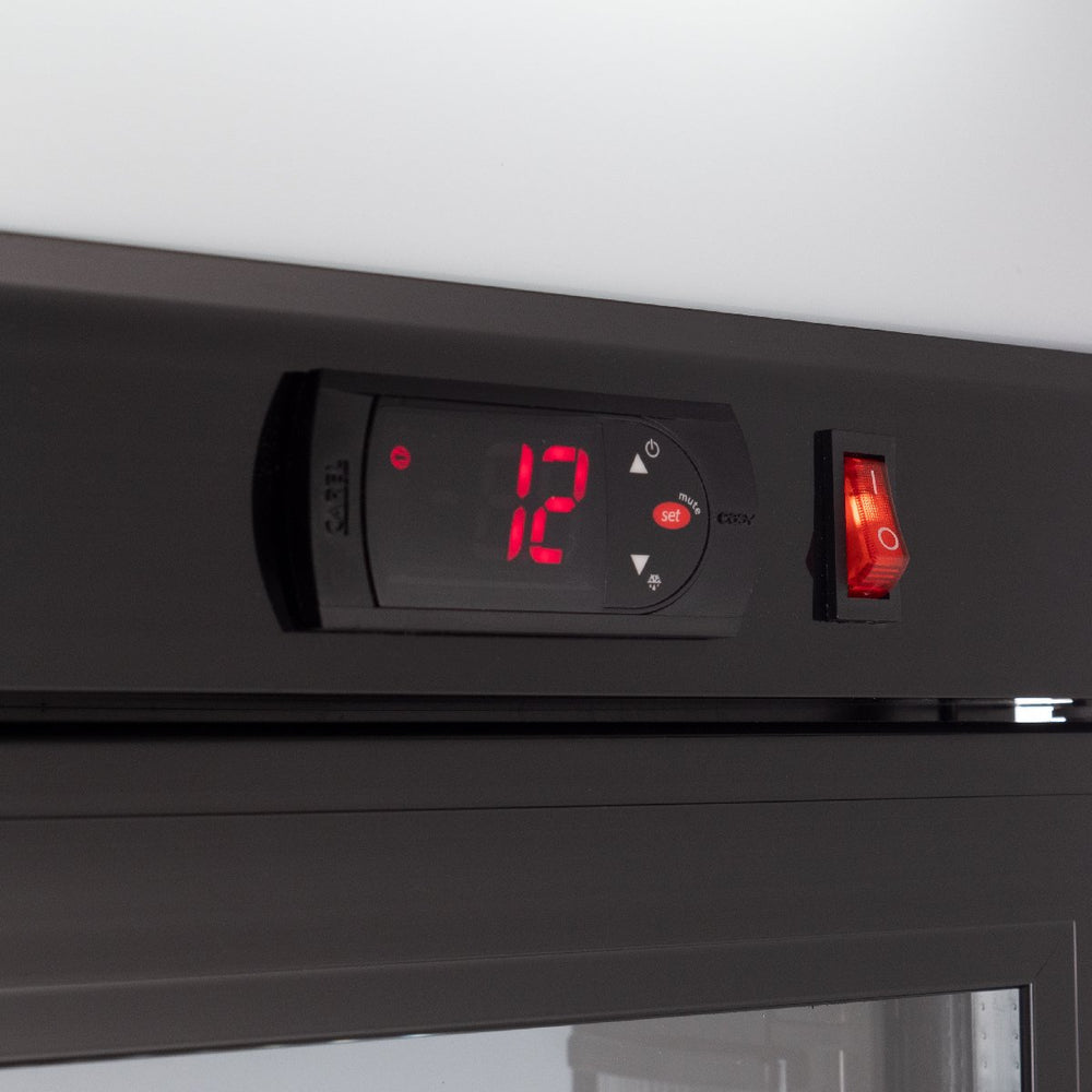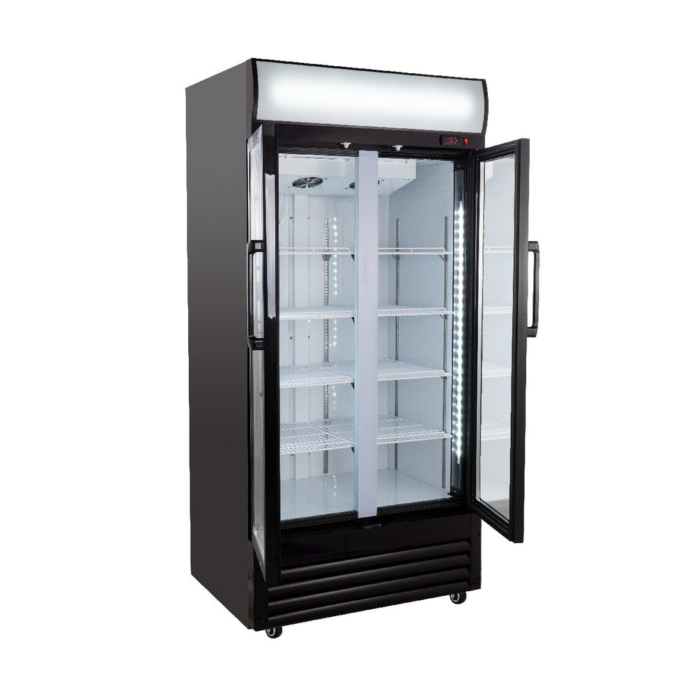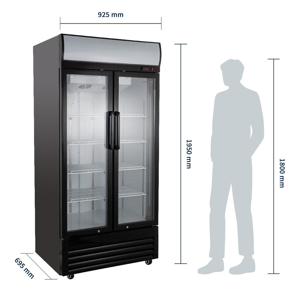 Getränkekühlschrank ECO 630 mit Leuchtreklame und Flügeltüren.