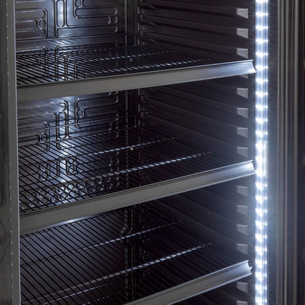 Der schwarze Getränkekühlschrank mit Umluftkühlung und Schloss ist ein zuverlässiger Partner für Ihre Verkaufs-Kühlung. Der Gewerbe Kühlschrank mit Glastür begeistert durch eine hochwertige Verarbeitung und garantiert deshalb eine lange Funktionsdauer auch bei hoher Beanspruchung. Die horizontale Beleuchtung unterstützt eine Präsentation der Produkte auf den 4 mitgelieferten Rosten.