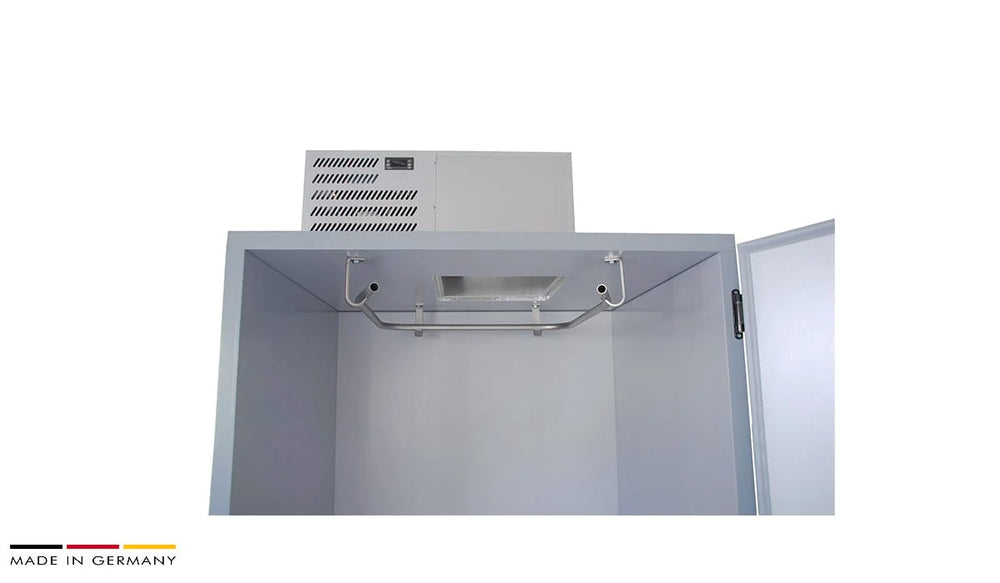 Der Hefa Wildkühlschrank WKS 1200 H aus deutscher Fertigung ist eine professionelle Aufbewahrungsmöglichkeit für Ihr Wild. Das Verbindungssystem macht ihn außerordentlich stabil und durch seine völlig verschleißfreie Zerlegbarkeit (ohne Werkzeug, keine Bügelverschlüsse o.ä.) kann er außerhalb der Jagdsaison in zerlegtem Zustand aufbewahrt werden. Die völlig glatten Innenseiten lassen sich besonders leicht reinigen. Für die Oberflächen wurde ein neuartiges, besonders pflegeleichtes Material mit modernem Metallic-Look verwendet. Die Tür hat eine leicht zu wechselnde Steckdichtung und einen hochwertigen verchromten und absperrbaren Kantenverschluss. Das Gewicht wird durch Edelstahl-Stellschienen unter dem Boden gleichmäßig verteilt. Mit den integrierten verstellbaren Füßen können Bodenunebenheiten ausgeglichen werden. Serienmäßig ist der WKS 1200 H mit einer nach außen verlängerbaren Rohrbahn ausgestattet.