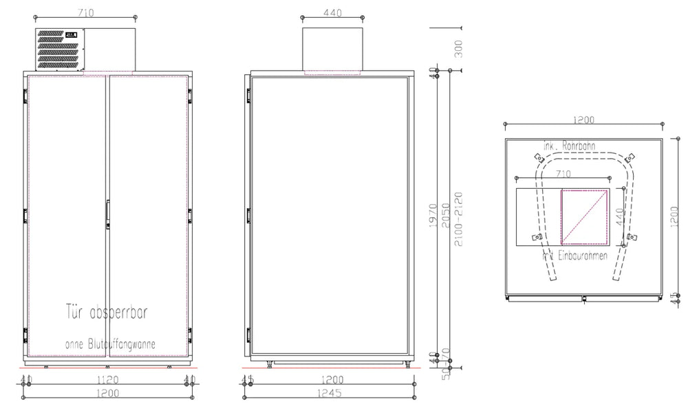 - Der mitgelieferte Kältesatz wird oben angebaut (siehe technische Zeichnung)