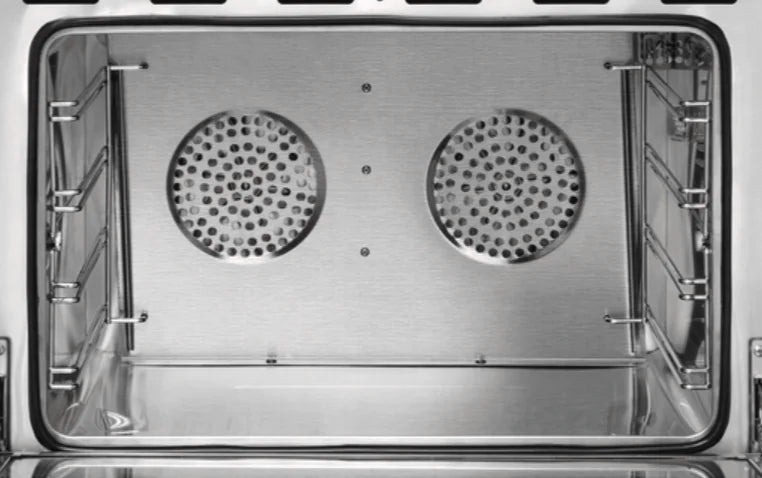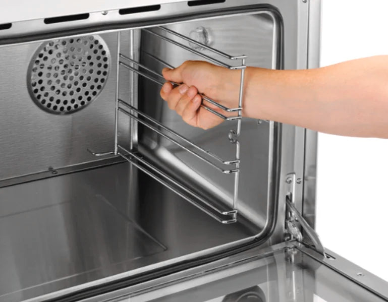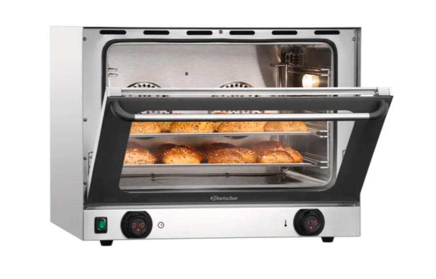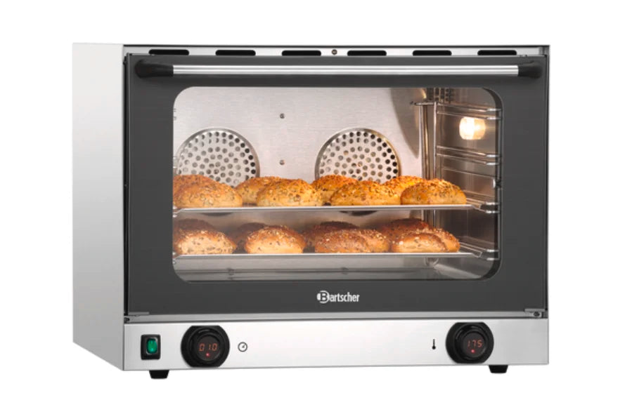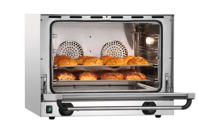Der Heißluftofen bietet einen angenehmen Bedienerkomfort mit dem digitalen Knebel. Die Temperatur kann einfach in 1°C - Schritten zwischen 50°C und 300°C eingestellt werde. Es besteht die Möglichkeit einer Pausierung des Garprozesses über den Temperaturregler. Die robuste - Edelstahlbackkammer besitzt vier praktische herausnehmbare Auflageschienen in GN 1/1 Format, die des Ermöglichen ein Rost oder GN - Behälter einzuschieben.
