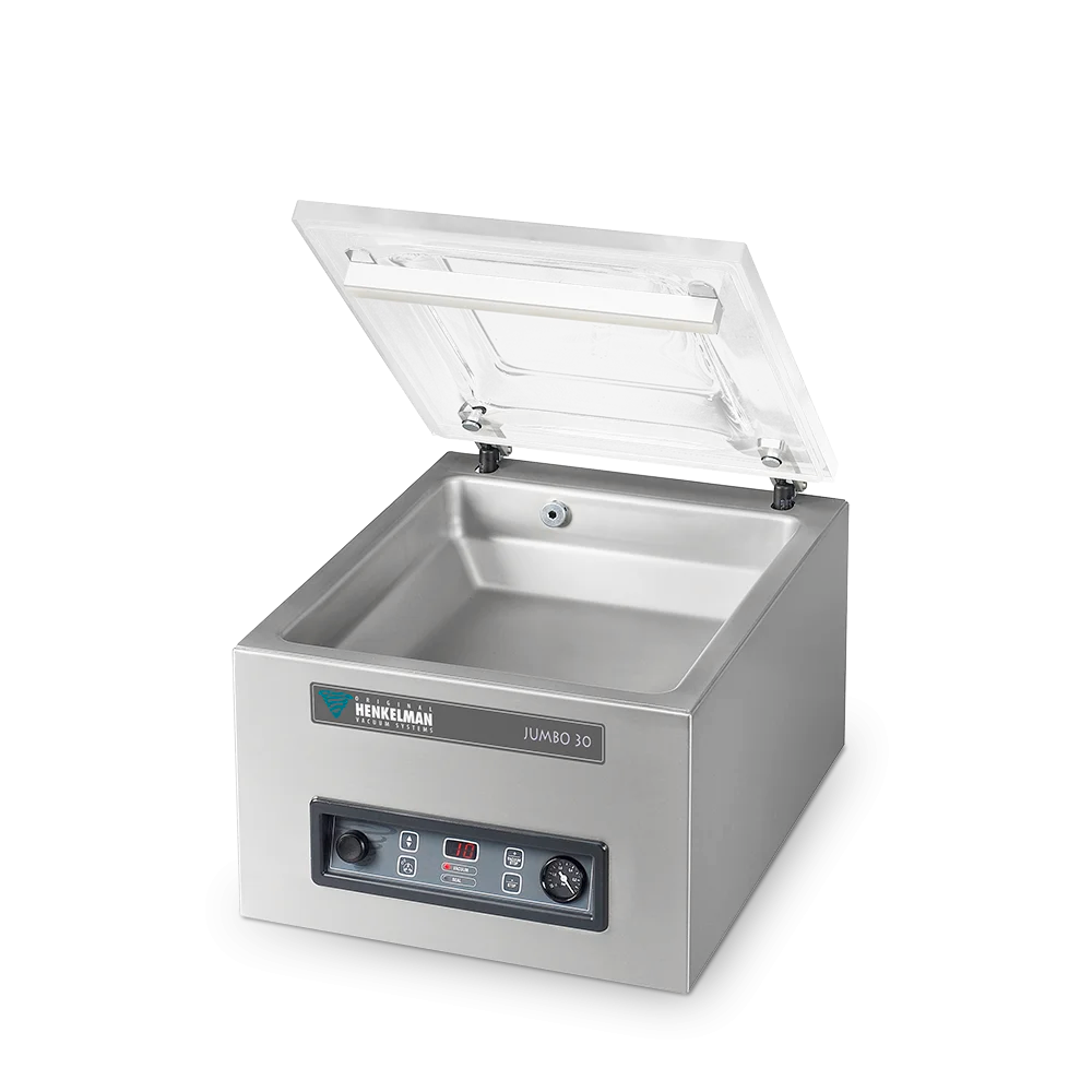 Die JUMBO Vakuumverpackungsmaschinen ermöglichen kompaktes Vakuumieren für ein professionelles Ergebnis. Sie sind das perfekte Einsteigermodell für die ersten Erfahrungen mit dem Vakuumieren und können mit bester Preis/ Leistung überzeugen. Die JUMBO Modelle sind serienmäßig mit einer Doppelschweißung und Sensorsteuerung ausgestattet. Insbesondere die Busch-Vakuumpumpe machen die Vakuumierer von Henkelman zu einzigartigen Vauumierern auf dem Markt. Sous-vide Garen wird hier auf ein ganz neues Level gebracht.