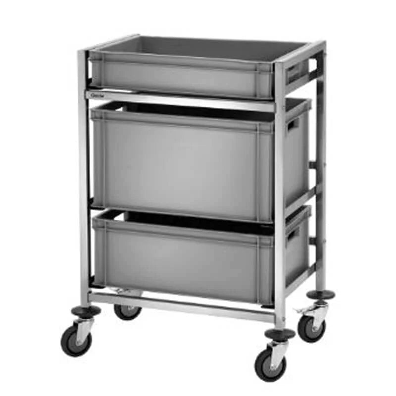 Dieser Spezial-Abräumwagen eignet sich überall dort, wo Euronorm-Kisten eingesetzt werden. Der Wagen verfügt über 3 Ablagen auf denen E1, E2 oder E3 Kisten perfekt abgestellt und sicher transportiert werden können. Der Wagen ist aus stabilen Vierkantrohren aus Chromstahl gefertigt, die 4 Lenkrollen sind mit einem Stoßschutz ausgestatett.