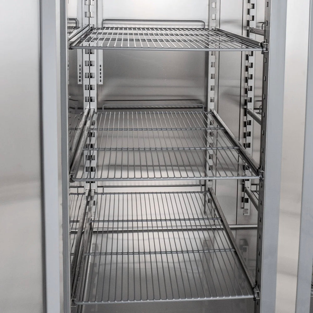 Mit dem Kühlschrank Profi 1400 GN 2/1 bietet GastroHero Ihnen ein Qualitätsprodukt aus europäischer Herstellung zu einem exzellenten Produktpreis. Der Kühlschrank aus Edelstahl überzeugt durch hohe Produktqualität, besondere Langlebigkeit, einmalige Funktionalität und modernes Design - nicht umsonst ist dieser Kühlschrank einer unserer Topseller-Produkte. Das hier verwendete Temperatur-Messsystem vemeidet zu häufiges Anspringen des Aggregats und arbeitet daher besonders energiesparsam und umweltschonend. Sobald die Produkte im Inneren die gewünschte Temperatur erreicht haben, sinkt der Energieverbrauch beträchtlich.