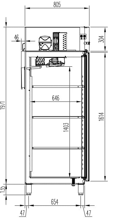 - gleichbleibende Kühlung durch automatisches Anhalten des Verdampferventilators bei Öffnung der Türen