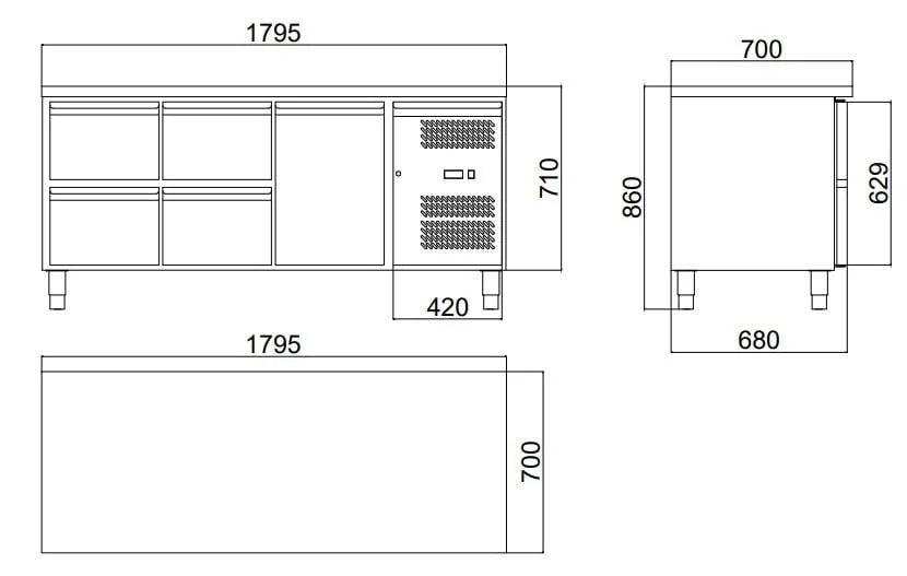 - Arbeitsplatte, Innenraum, Tür, Schubladen und Seitenteile aus hochwertigem Edelstahl
