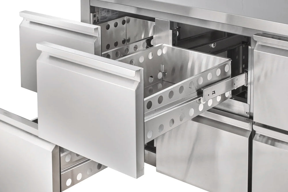 - Arbeitsplatte, Innenraum, Tür, Schubladen und Seitenteile aus hochwertigem Edelstahl