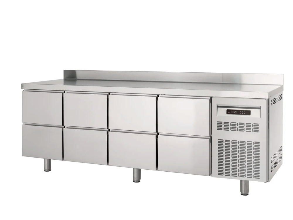 Unsere Kühltische aus der PROFI-Serie überzeugen mit ihrem neuen, modernen Design, hoher Funktionalität, Langlebigkeit sowie einer hochwertigen Verarbeitung. Dank des idealen Temperaturbereichs von -2°C bis +8°C können Sie Ihre Lebensmittel optimal gekühlt lagern. Das hier verwendete Temperatur-Messsystem vemeidet zu häuiges Anspringen des Aggregats und arbeitet daher besonders energiesparsam und umweltschonend. Sie können die Tempersatur ganz einfach mit dem neuen, digitalen Thermostat überwachen. Sobald die Produkte im Inneren die gewünschte Temperatur erreicht haben, sinkt der Energieverbrauch beträchtlich. Unsere PROFI-Kühltische bieten eine perfekte Mischung zwischen Arbeitsfläche und Lagerfläche.
