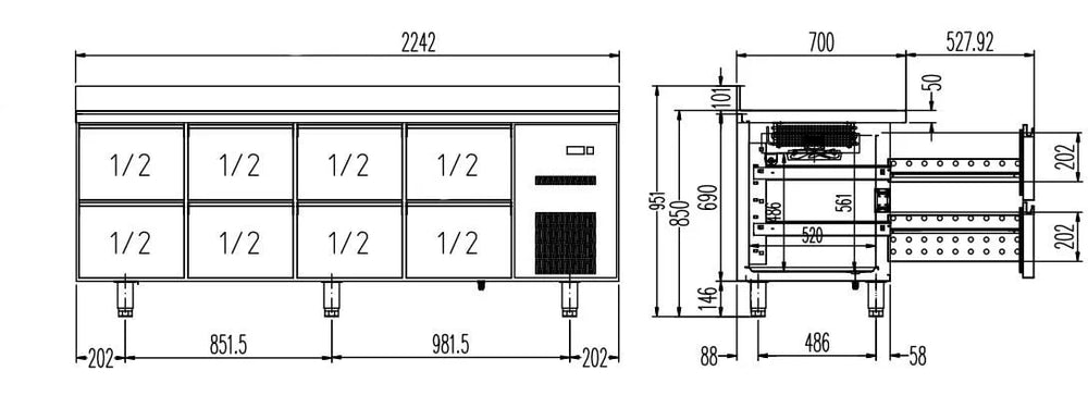 - maximale Höhe für GN-Behälter in der oberen Schublade neben dem Aggregat: 100 mm