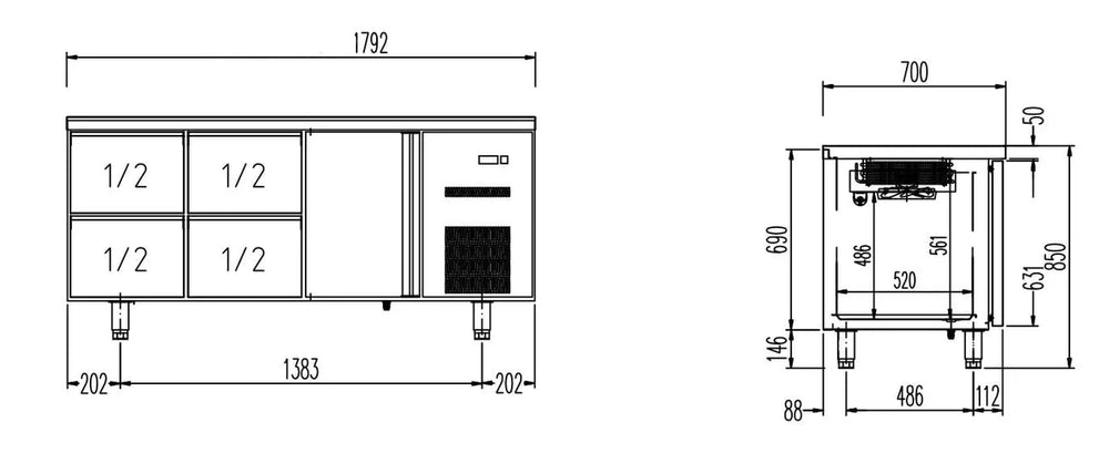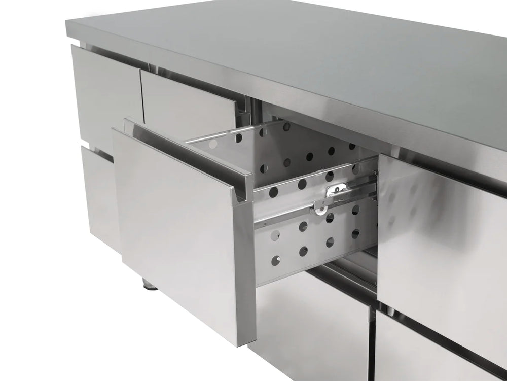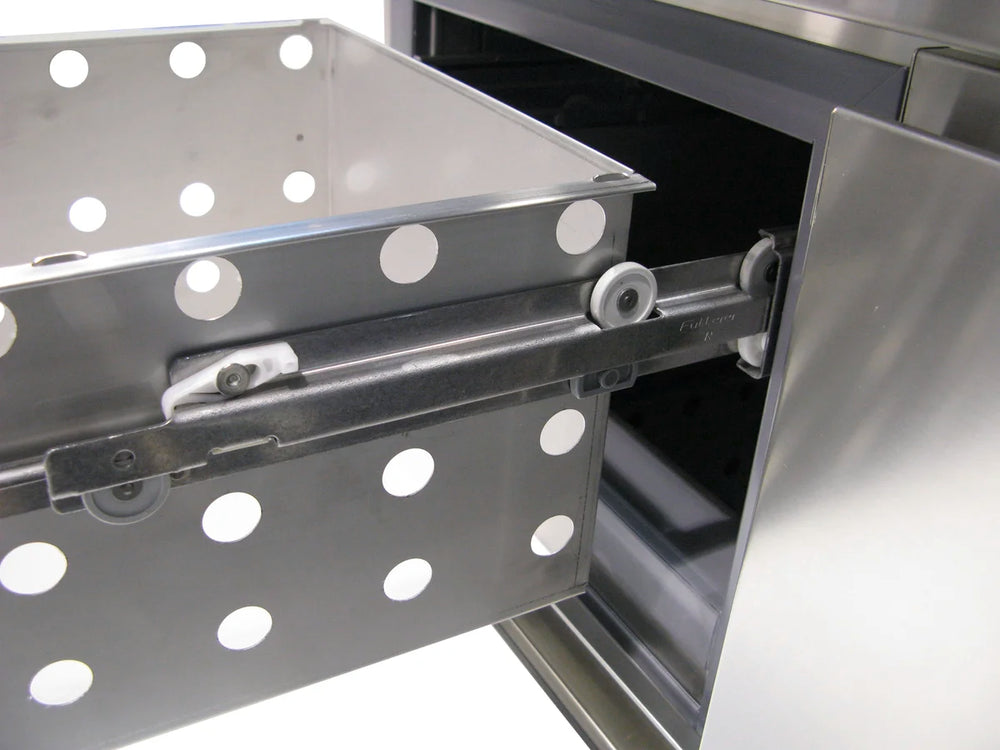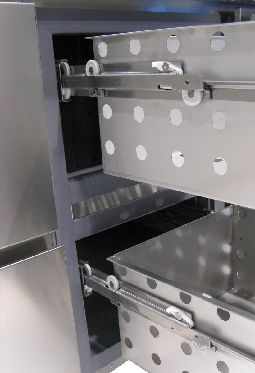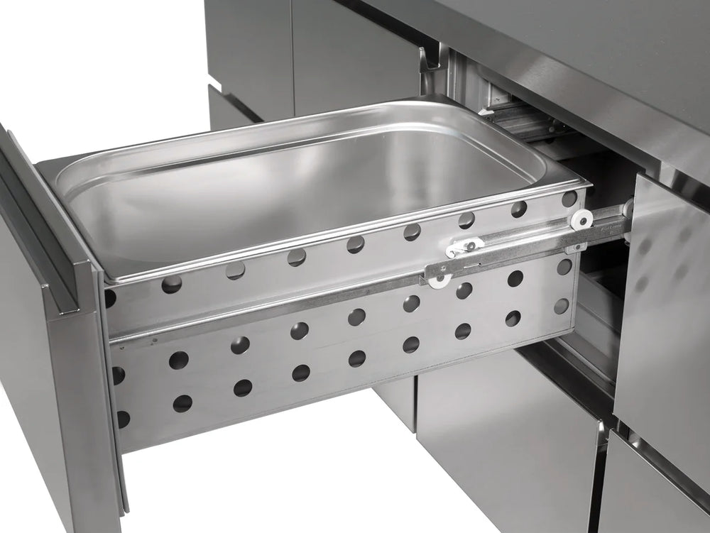- Arbeitsplatte, Innenraum, Tür, Schubladen und Seitenteile aus hochwertigem Chromstahl