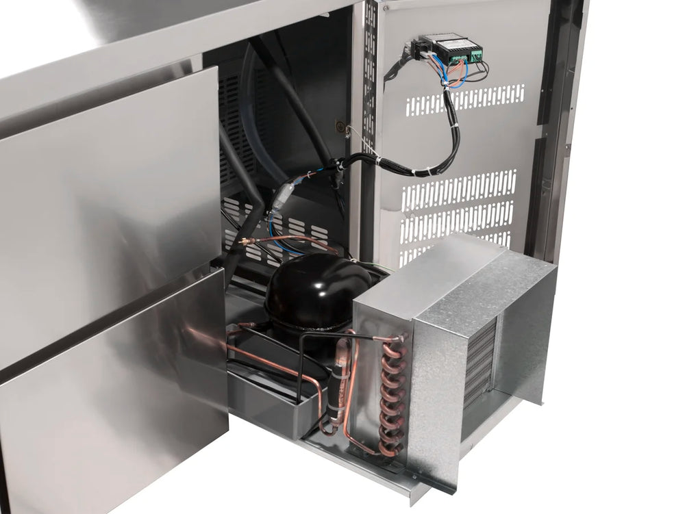 Unsere Kühltische aus der PROFI-Serie überzeugen mit modernem Design, hoher Funktionalität, Langlebigkeit sowie einer hochwertigen Verarbeitung. Dank des idealen Temperaturbereichs von -2°C bis +8°C können Sie Ihre Lebensmittel optimal gekühlt lagern. Das hier verwendete Temperatur-Messsystem vemeidet zu häufiges Anspringen des Aggregats und arbeitet daher besonders energiesparsam und umweltschonend. Sobald die Produkte im Inneren die gewünschte Temperatur erreicht haben, sinkt der Energieverbrauch beträchtlich. Unsere PROFI-Kühltische bieten eine perfekte Mischung zwischen Arbeitsfläche und Lagerfläche.