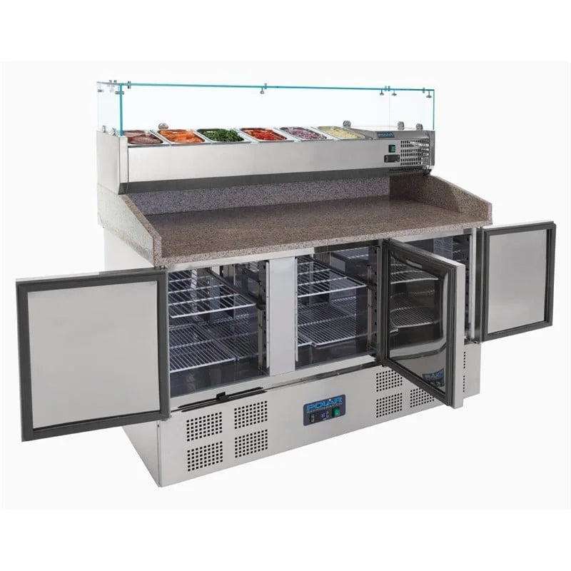 Zubereitungskühltisch mit Marmorarbeitsplatte und geschütztem Aufbau mit GN-Bereich. Elektronische Steuerung mit digitaler Anzeige. Teilweise Abtauung in Zeitintervallen. Manuelle Abtauung regelmäßig notwendig. FCKW-frei. GN-Behälter separat erhältlich.