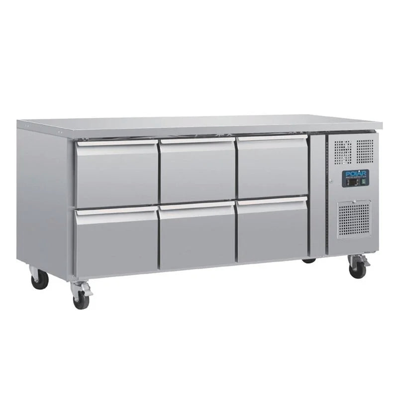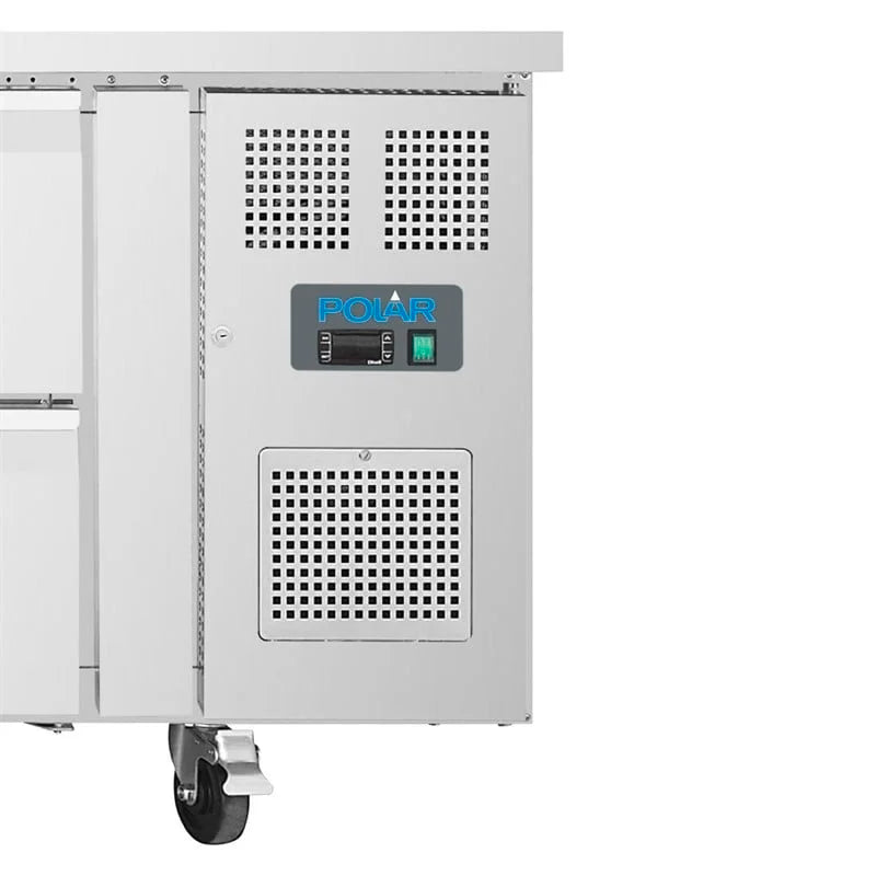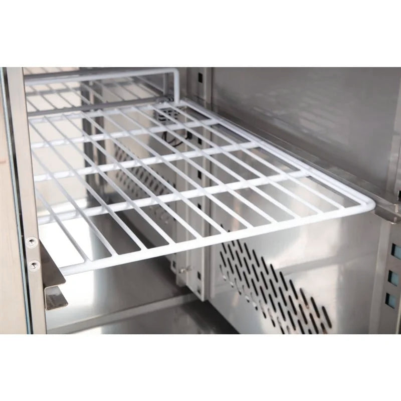 Mit den GN1/1-kompatiblen Schubladen halten Sie große Mengen fertig zum Verarbeiten und Servieren. Zwei der vier Rollen können entriegelt werden, damit die Tische einfach verschoben werden können. Hergestellt aus strapazierfähigem Edelstahl.
